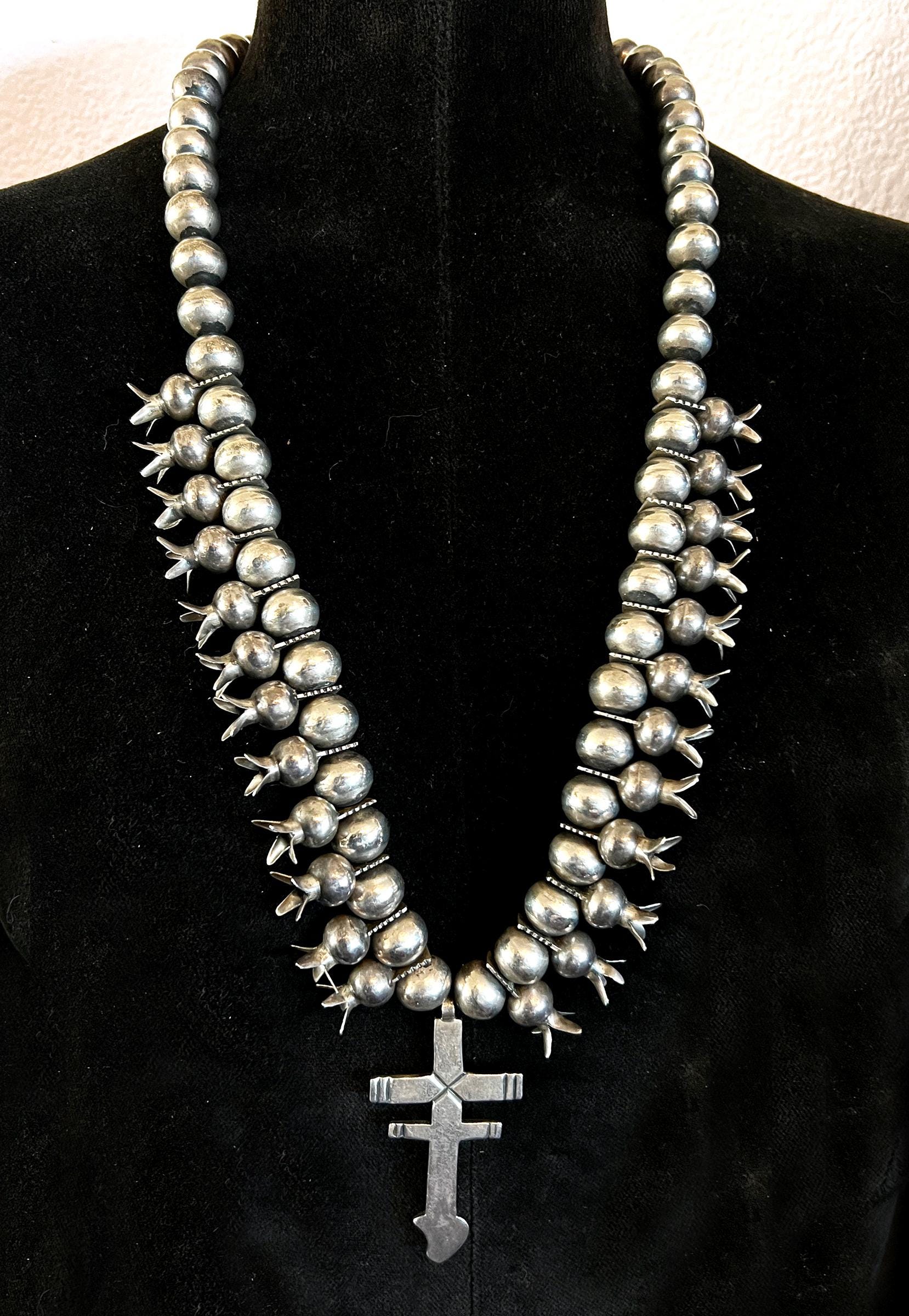 Sterling silver dragonfly cross squash blossom necklace, made by D. Lucas (Anglo).