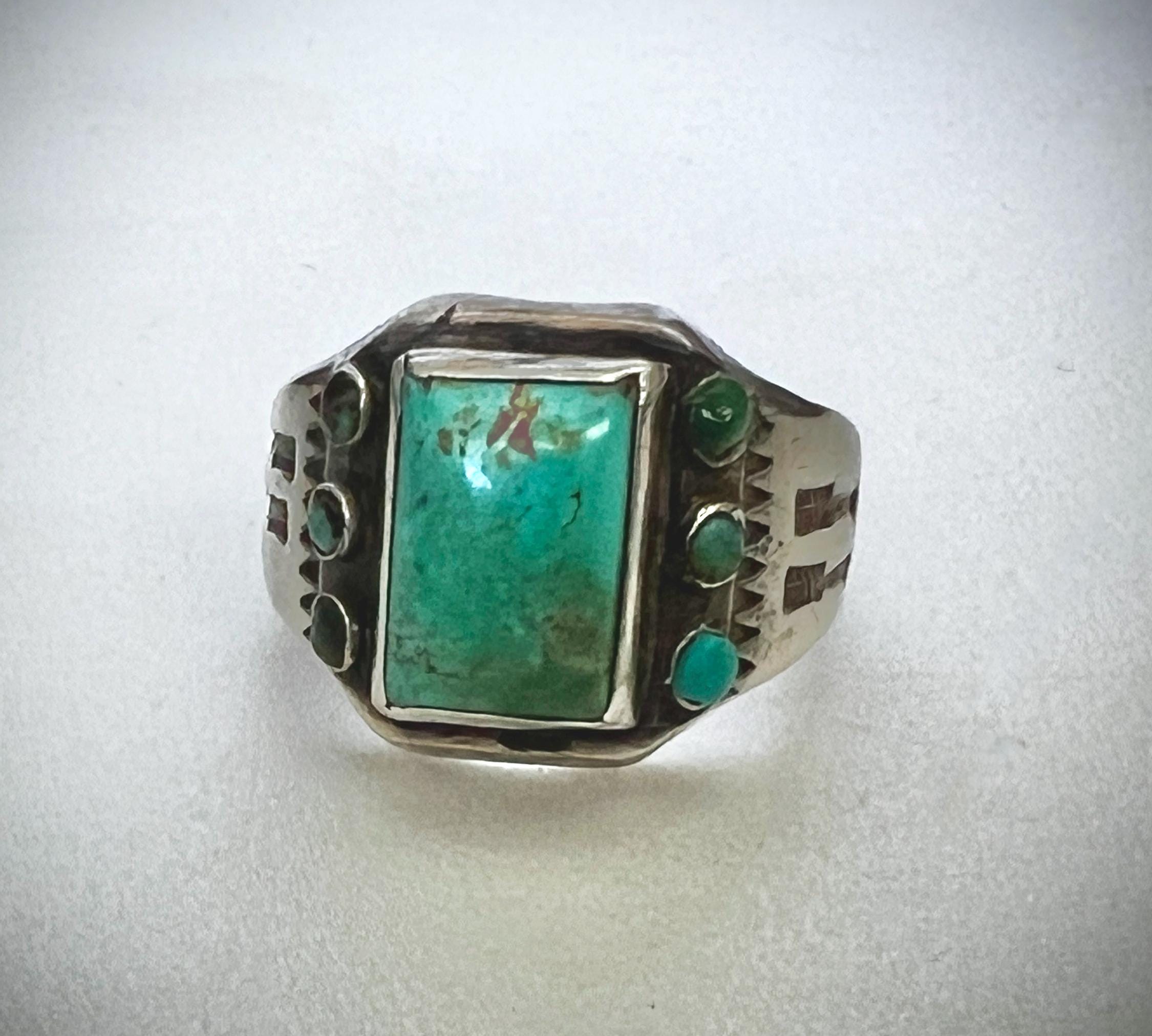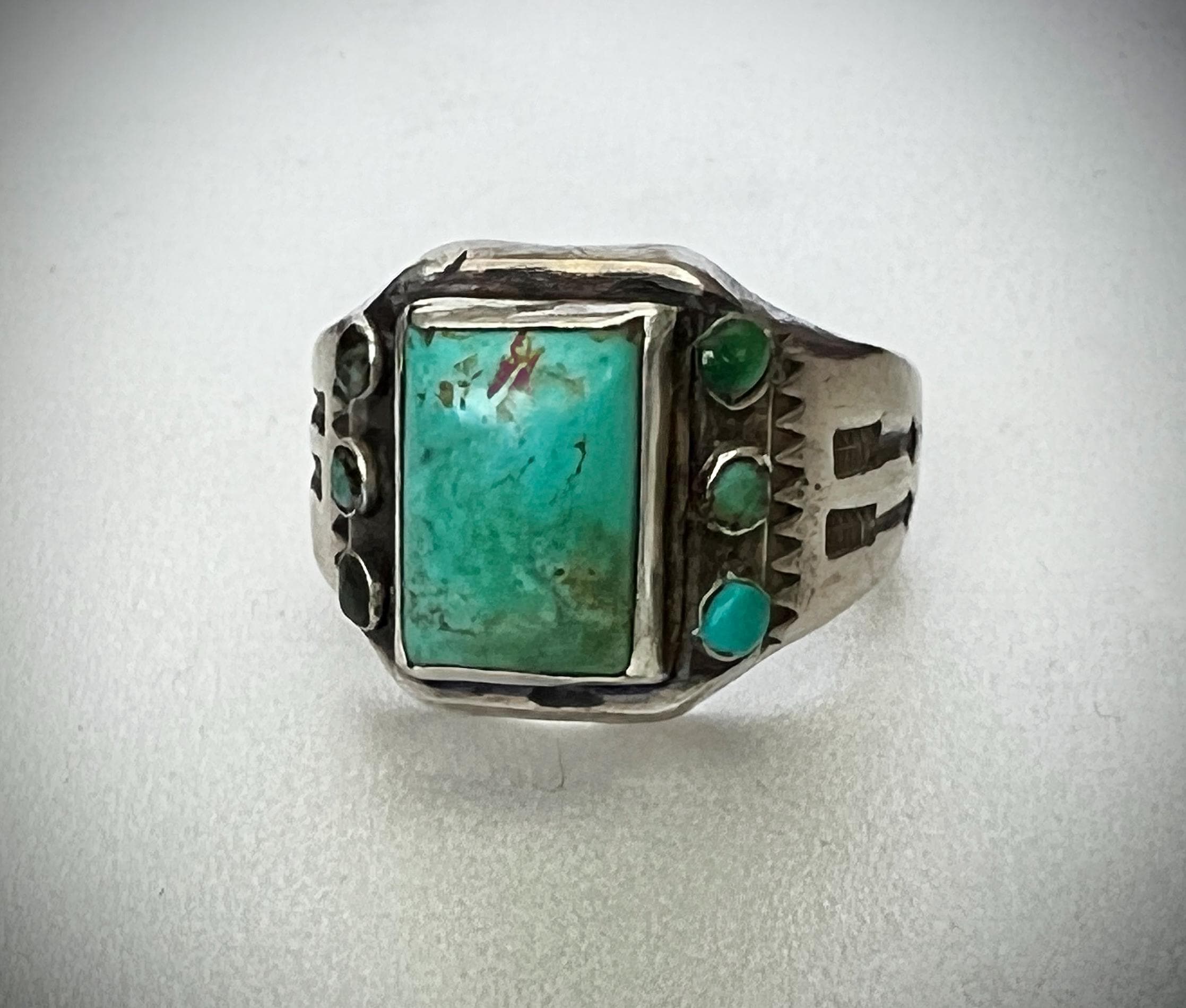 Early 20th century Navajo ring with central rectangular turquoise cabochon flanked by 3 small round turquoise stones on each side. The heavy silver shank has 2 arrows stamped on each side. US size 6