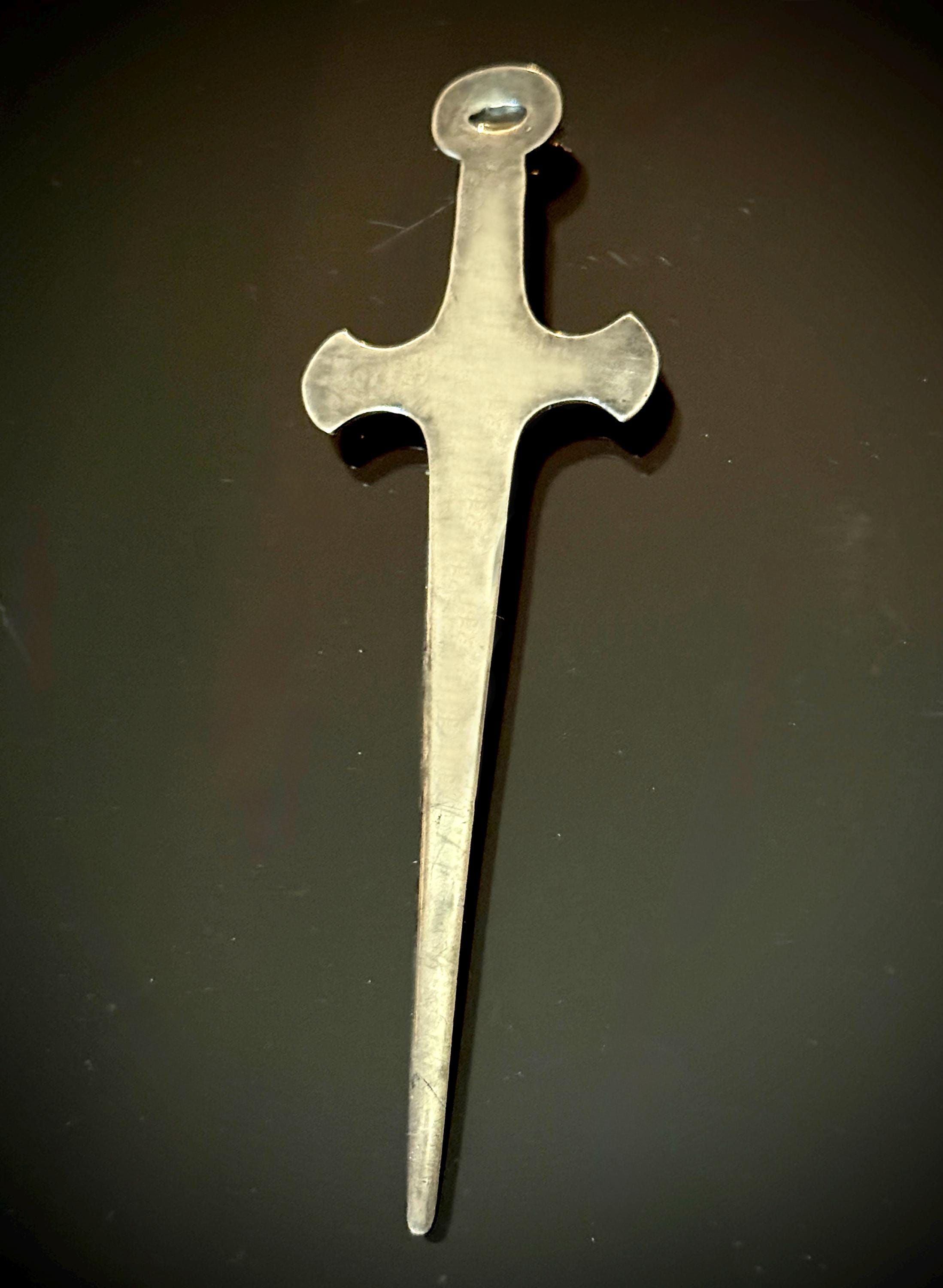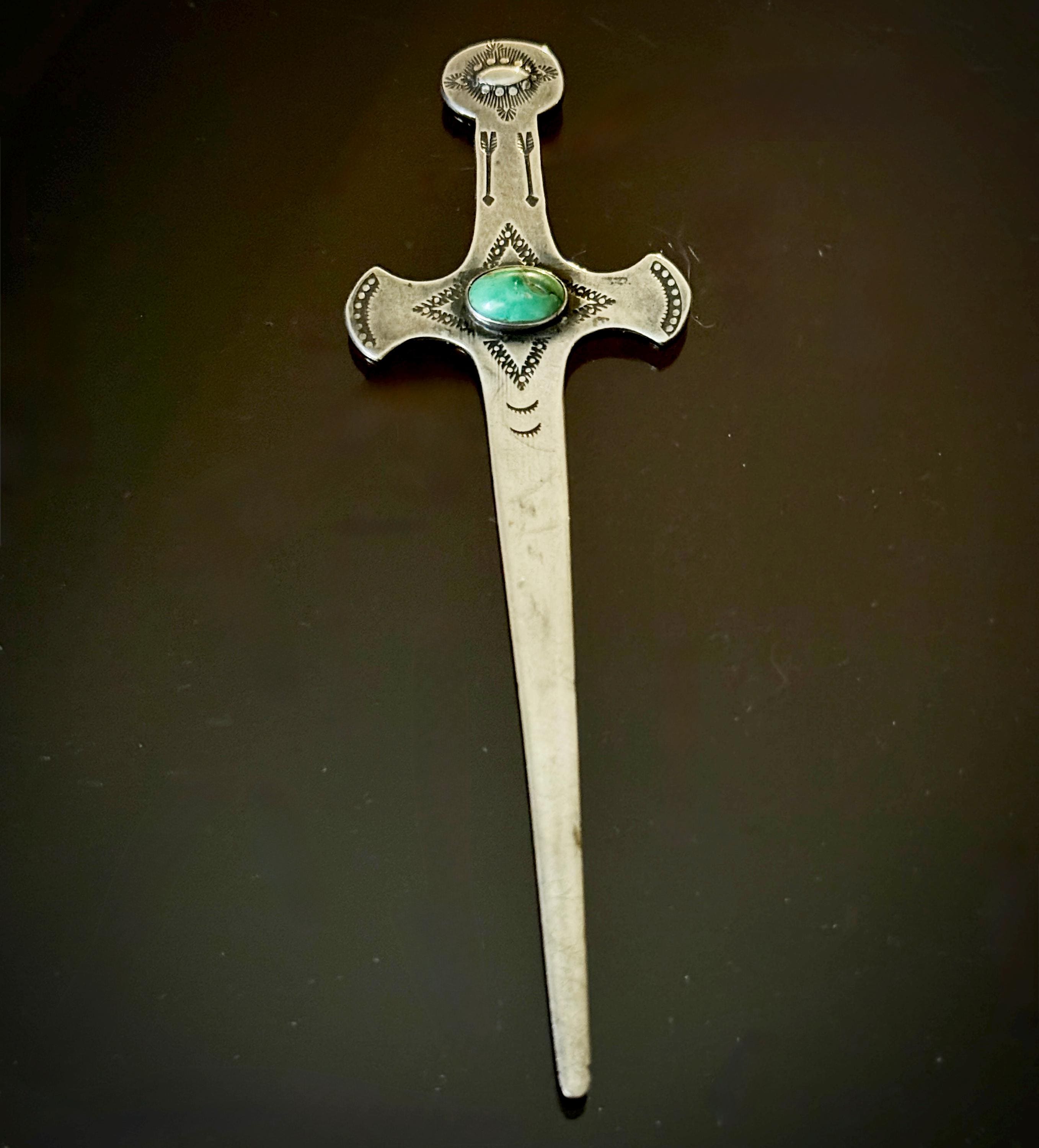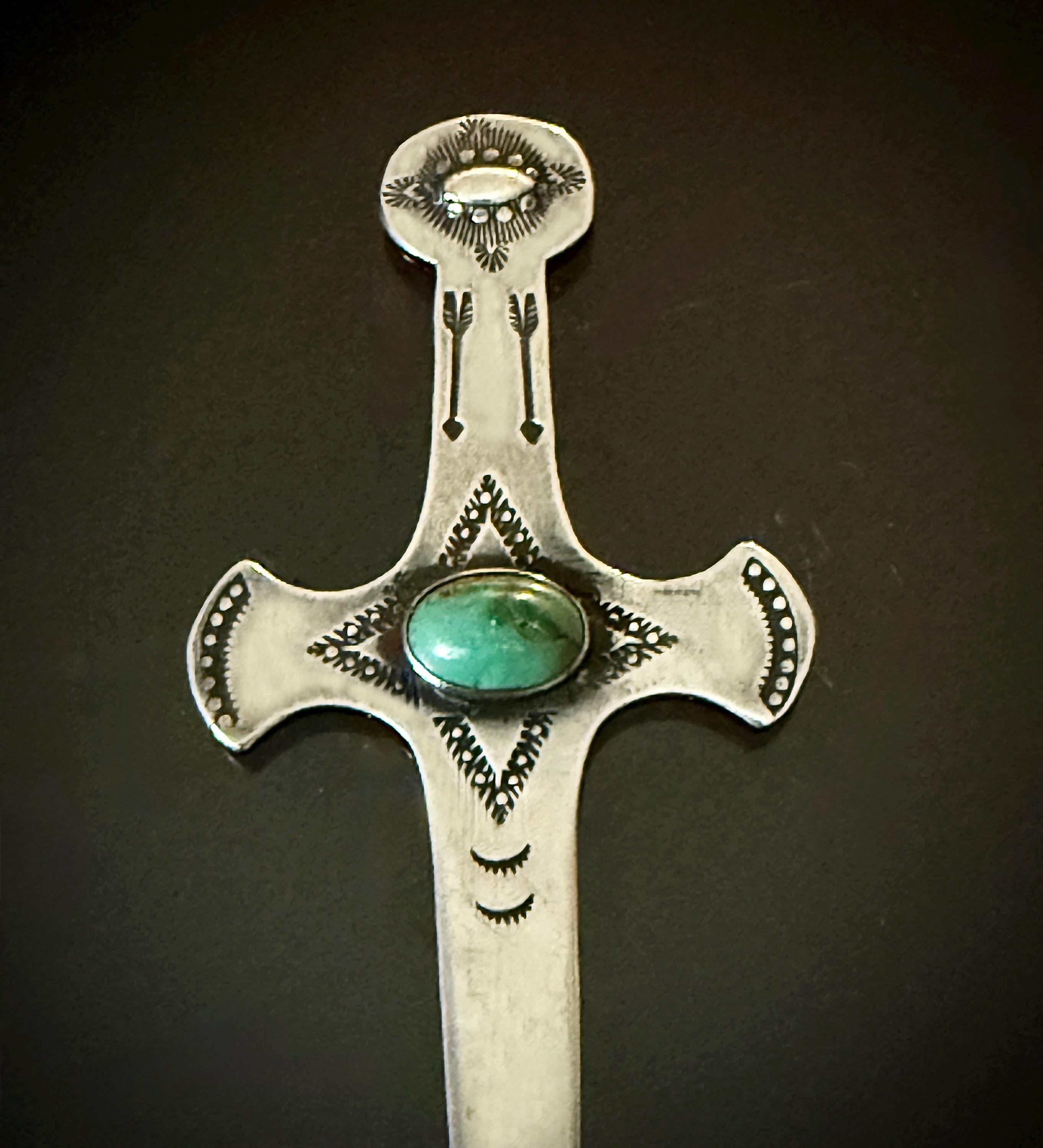 Cross shaped silver Navajo letter opener beautifully stamped with arrows, dots and repoussé, and in the center a green turquoise cabochon.