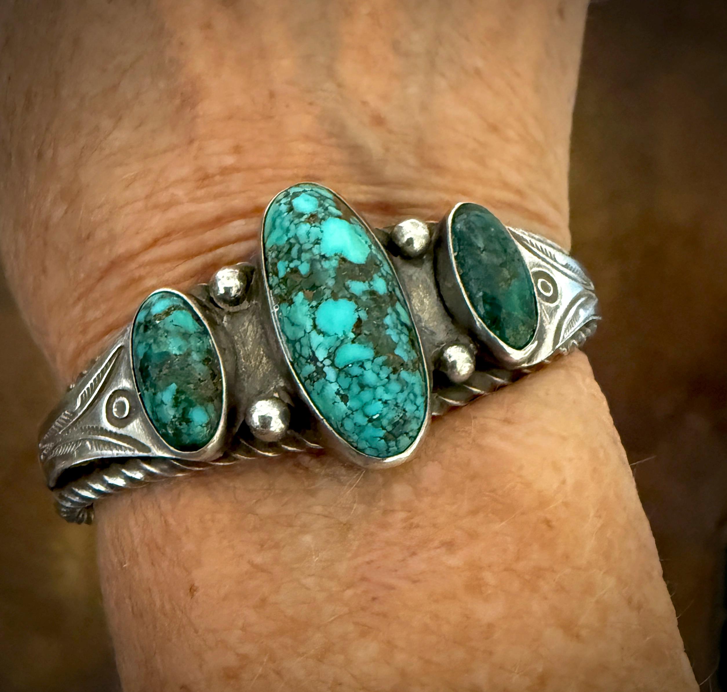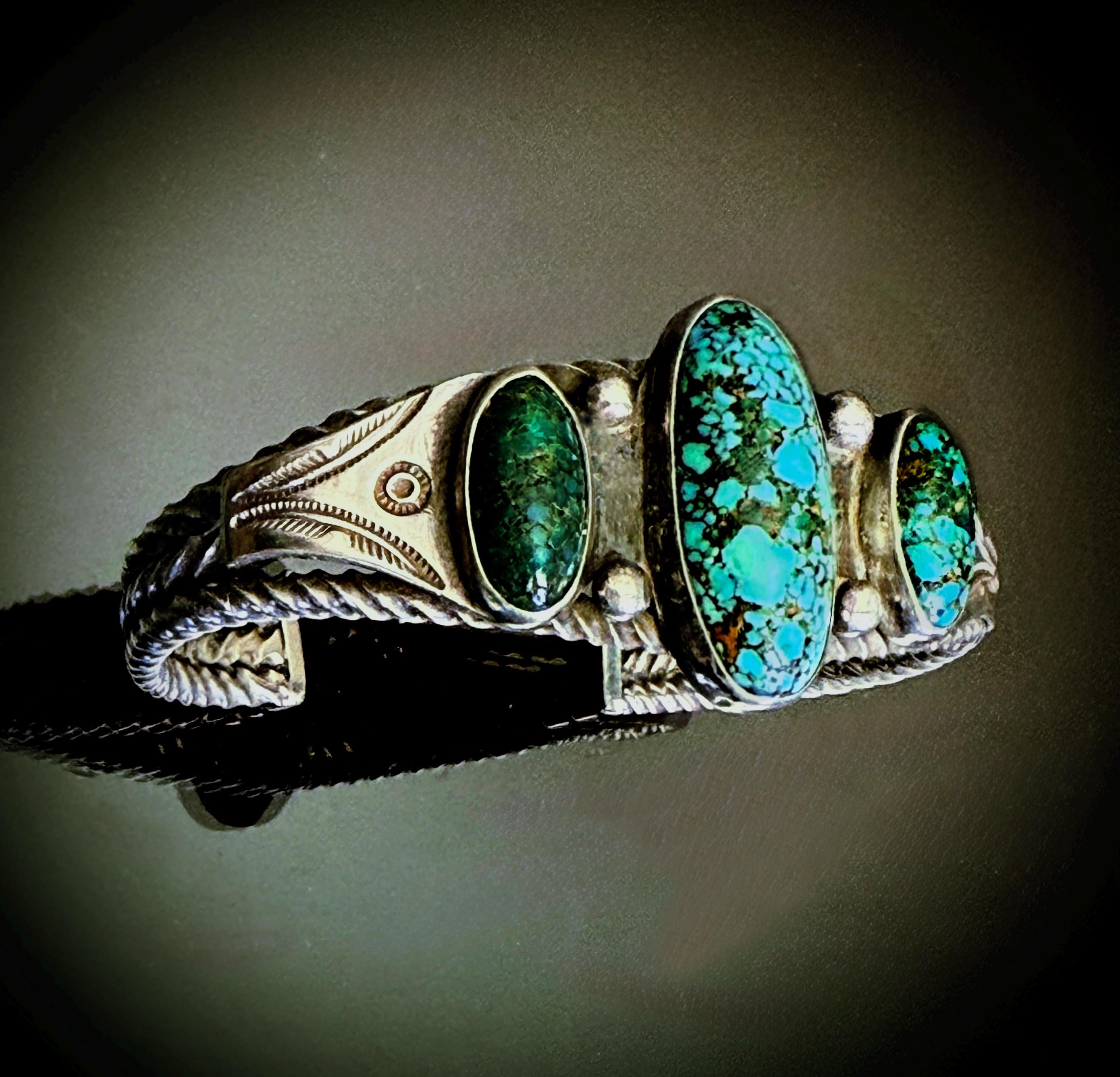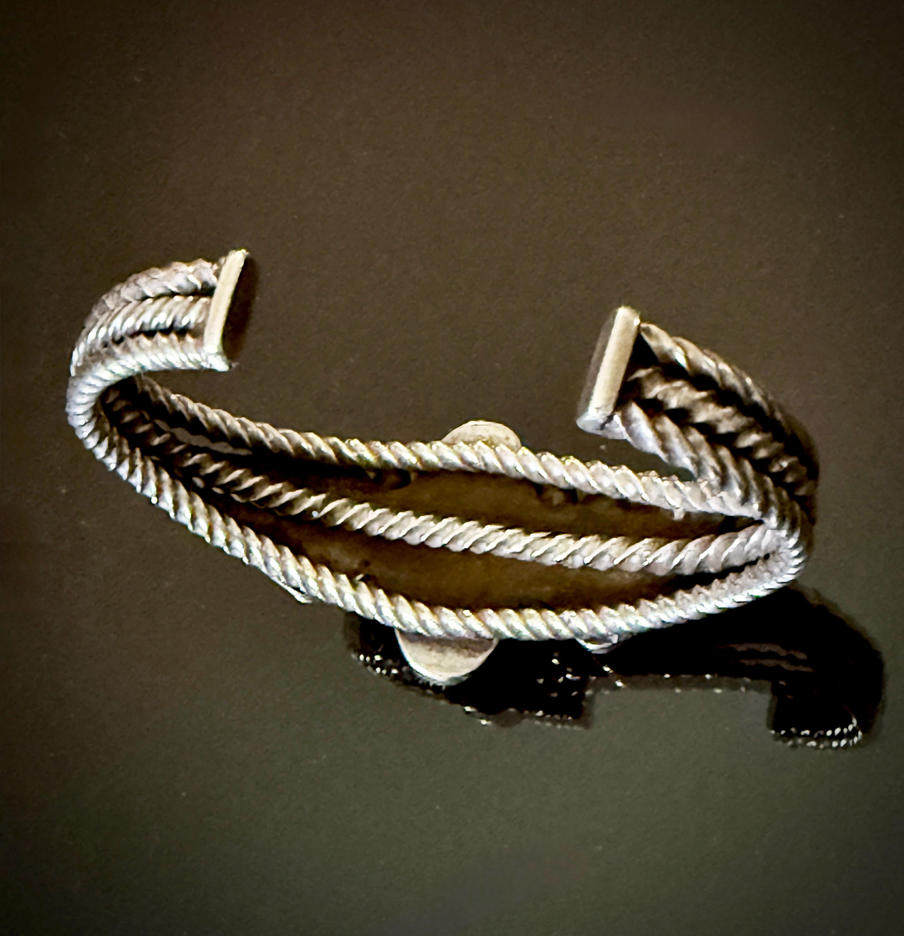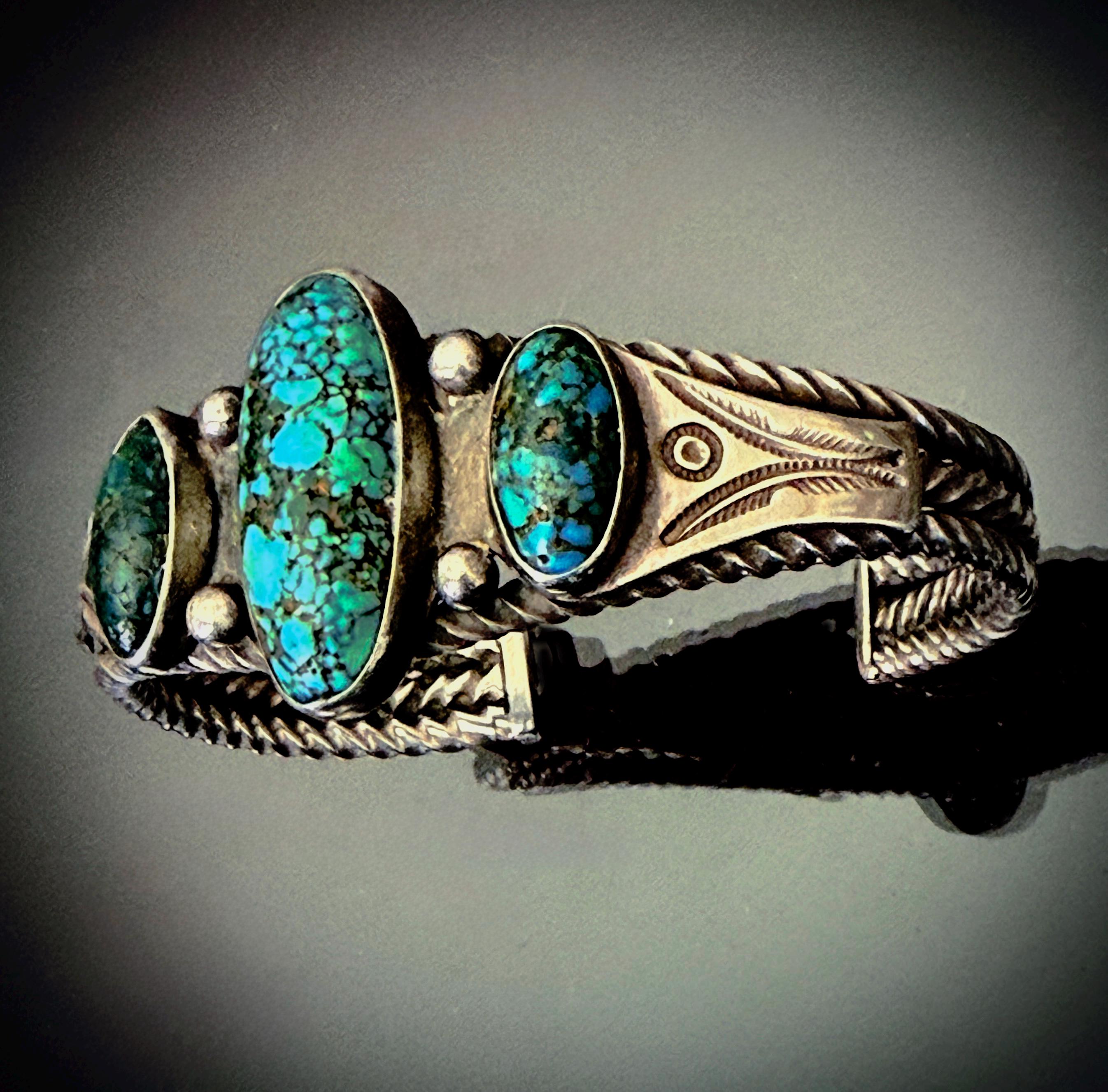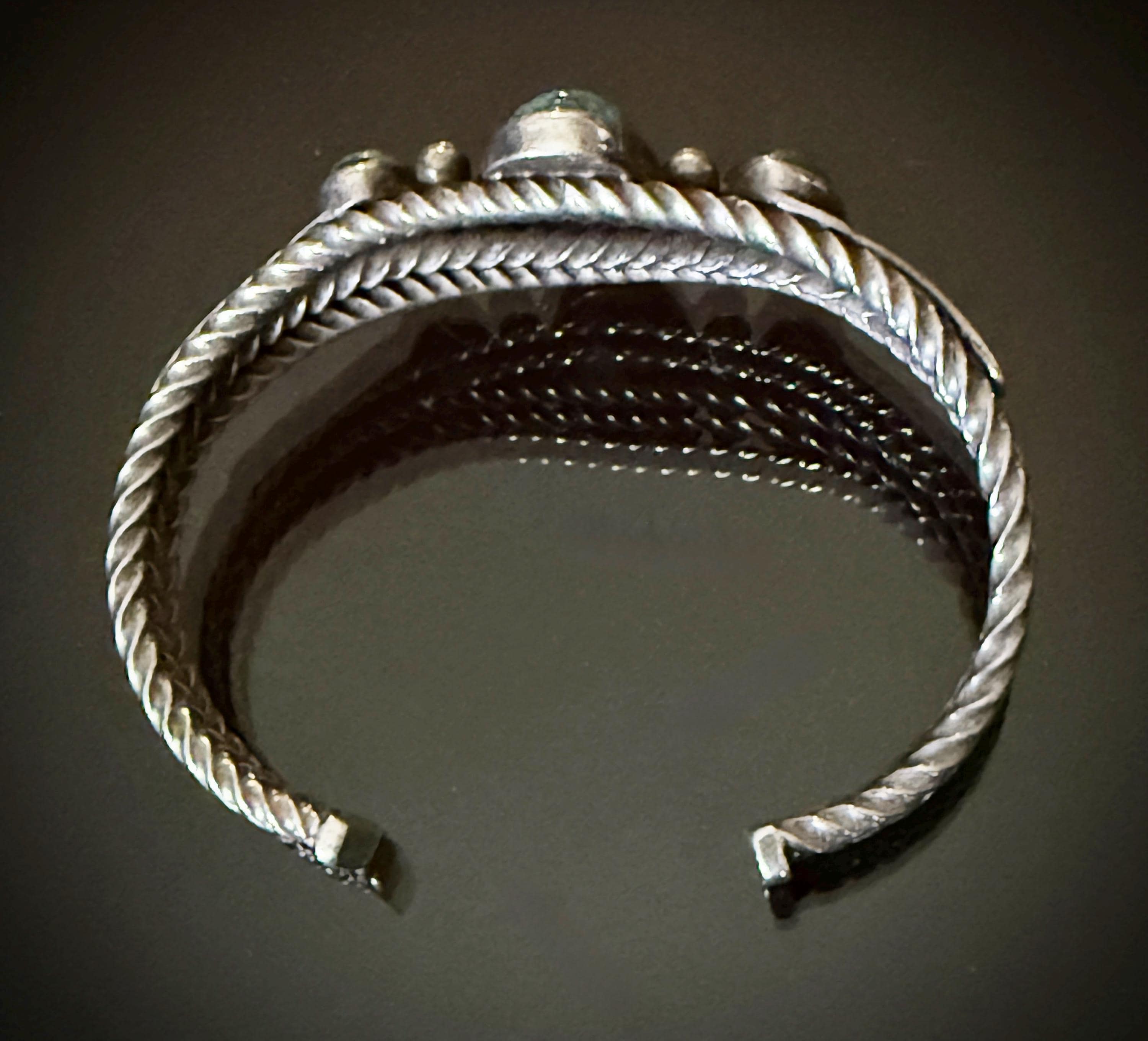Navajo or Pueblo bracelet circa 1920 made up of 3 drawn and twisted wires. It has a large central oval turquoise cabochon and two smaller ovals on each side, set on a silver plate that extends beyond the stones. Each side of the plate is hand stamped and there are silver raindrops between the stones.