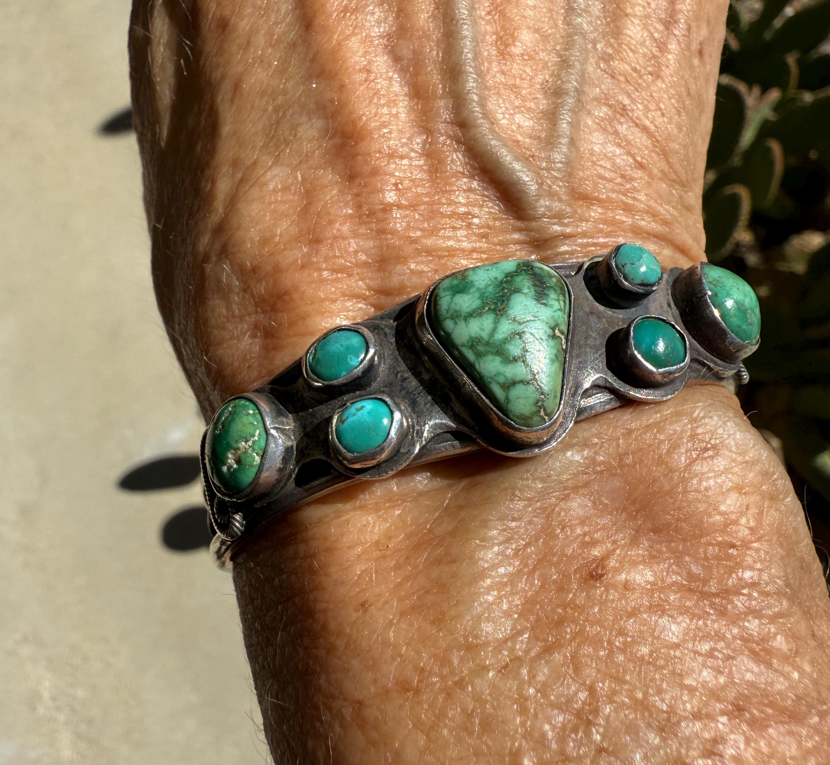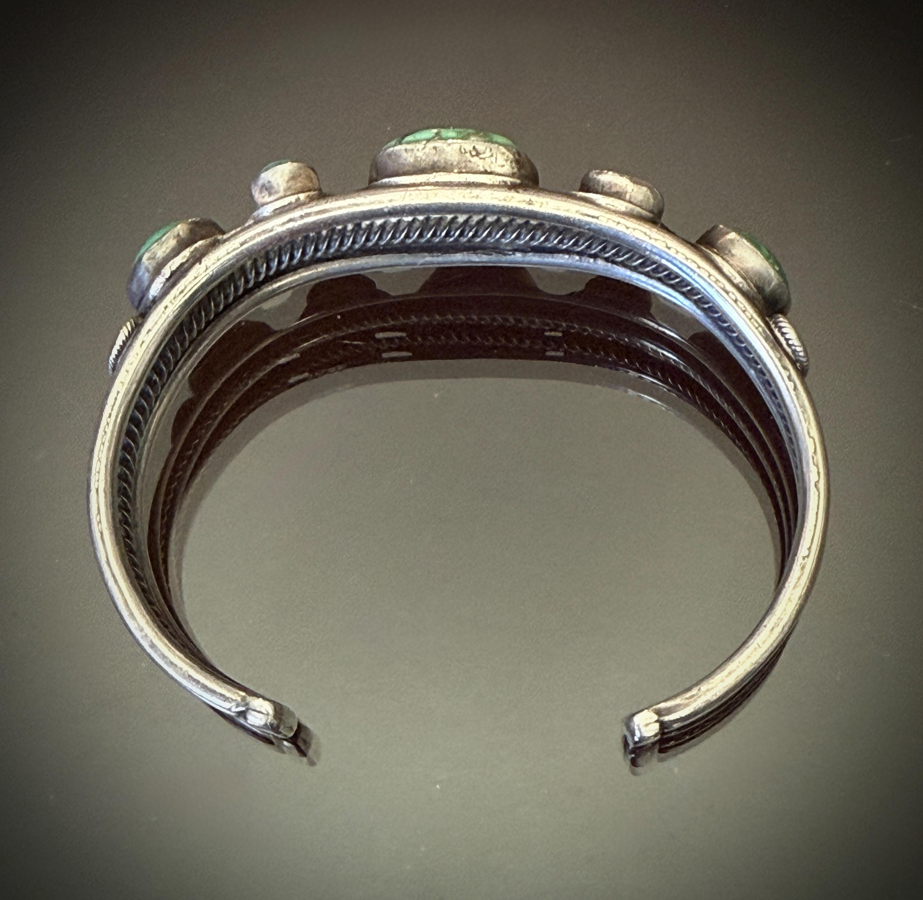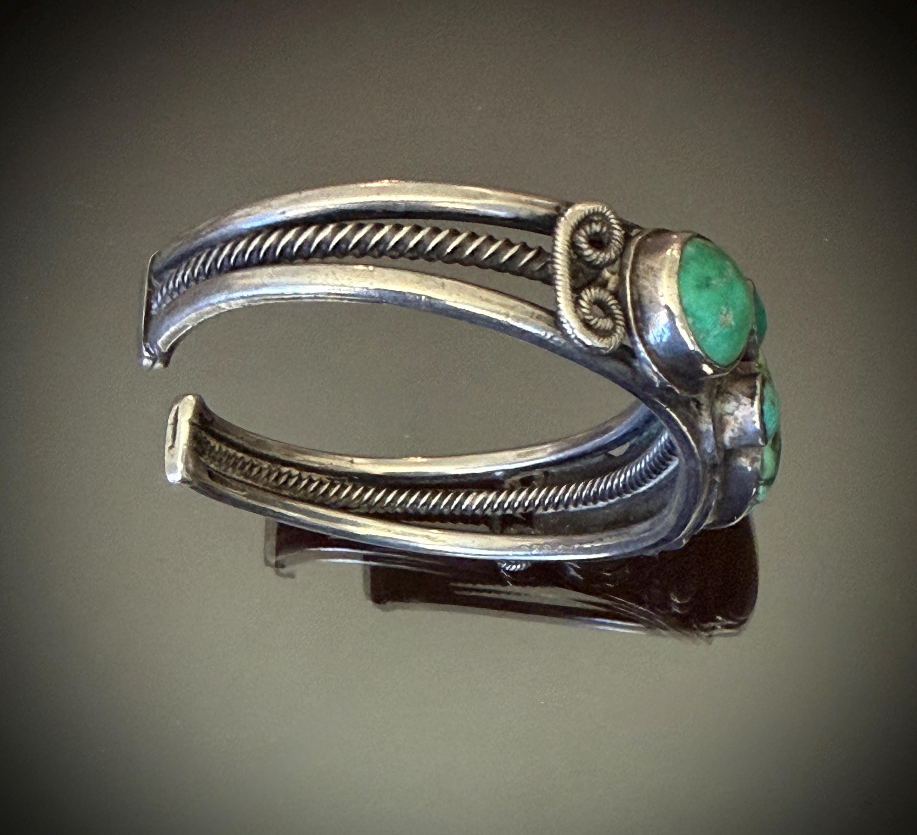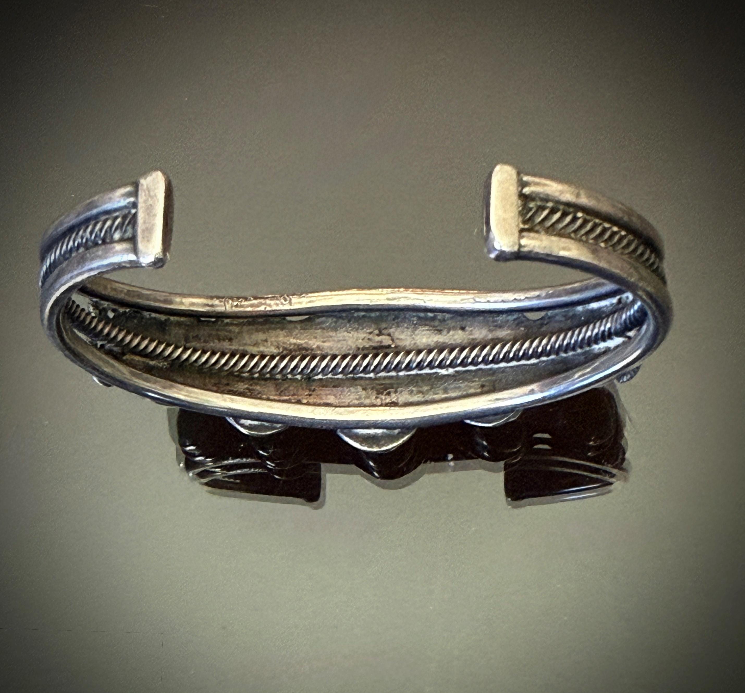 Most likely Pueblo made, due to the twisted wire design on each end of the central plate which Pueblo silversmiths were known for. The bracelet is created with two silver outer bands and a twisted wire band in the middle. The silver overlaid plate has been shaped around the stone placement. The central stone is a rounded triangle, flanked by two small round stones and a larger round stone on the ends. The terminals are capped. Lots of smoothing of edges on this cuff due to continuous wear over the years. Weight is 38 grams. 1900-1915