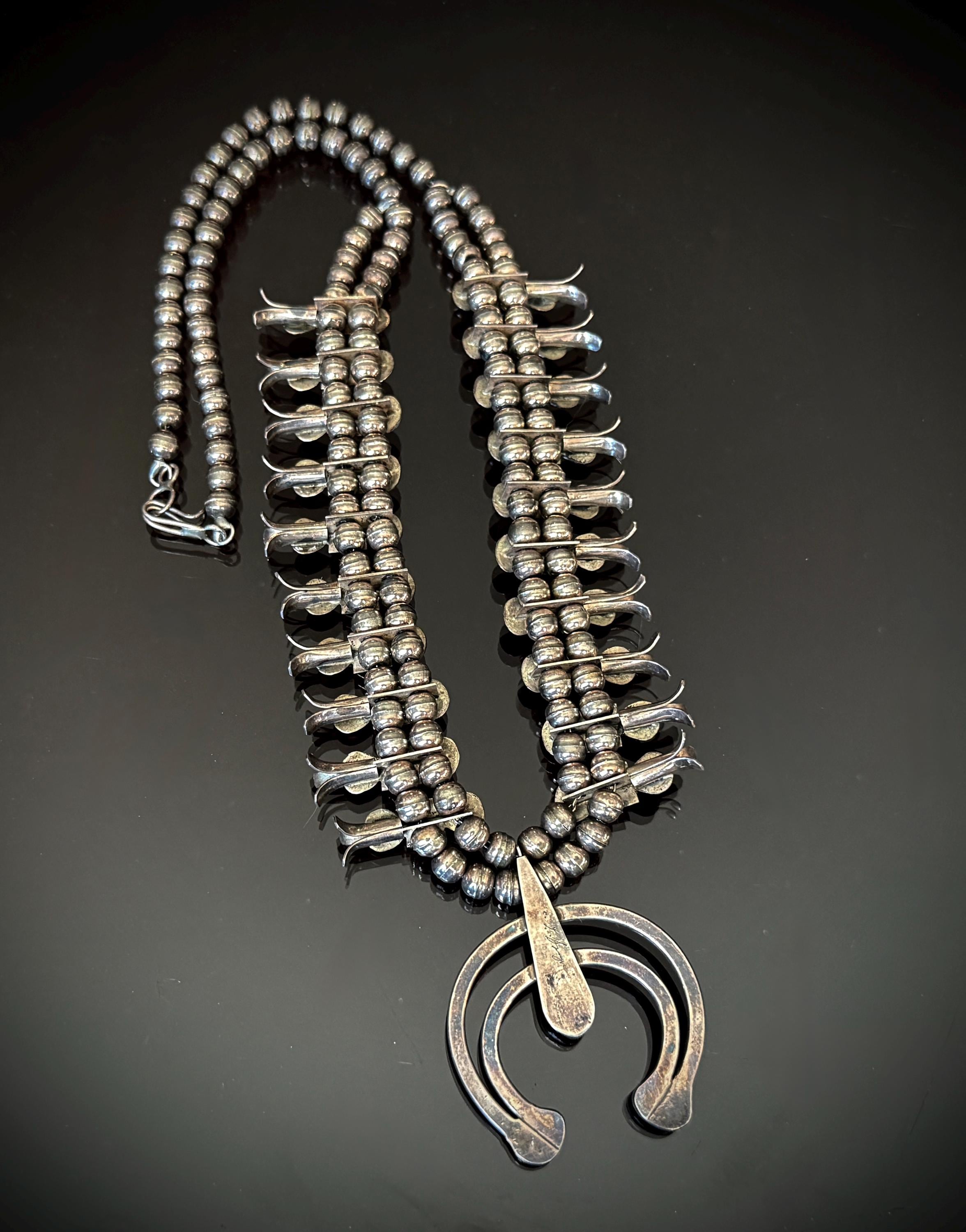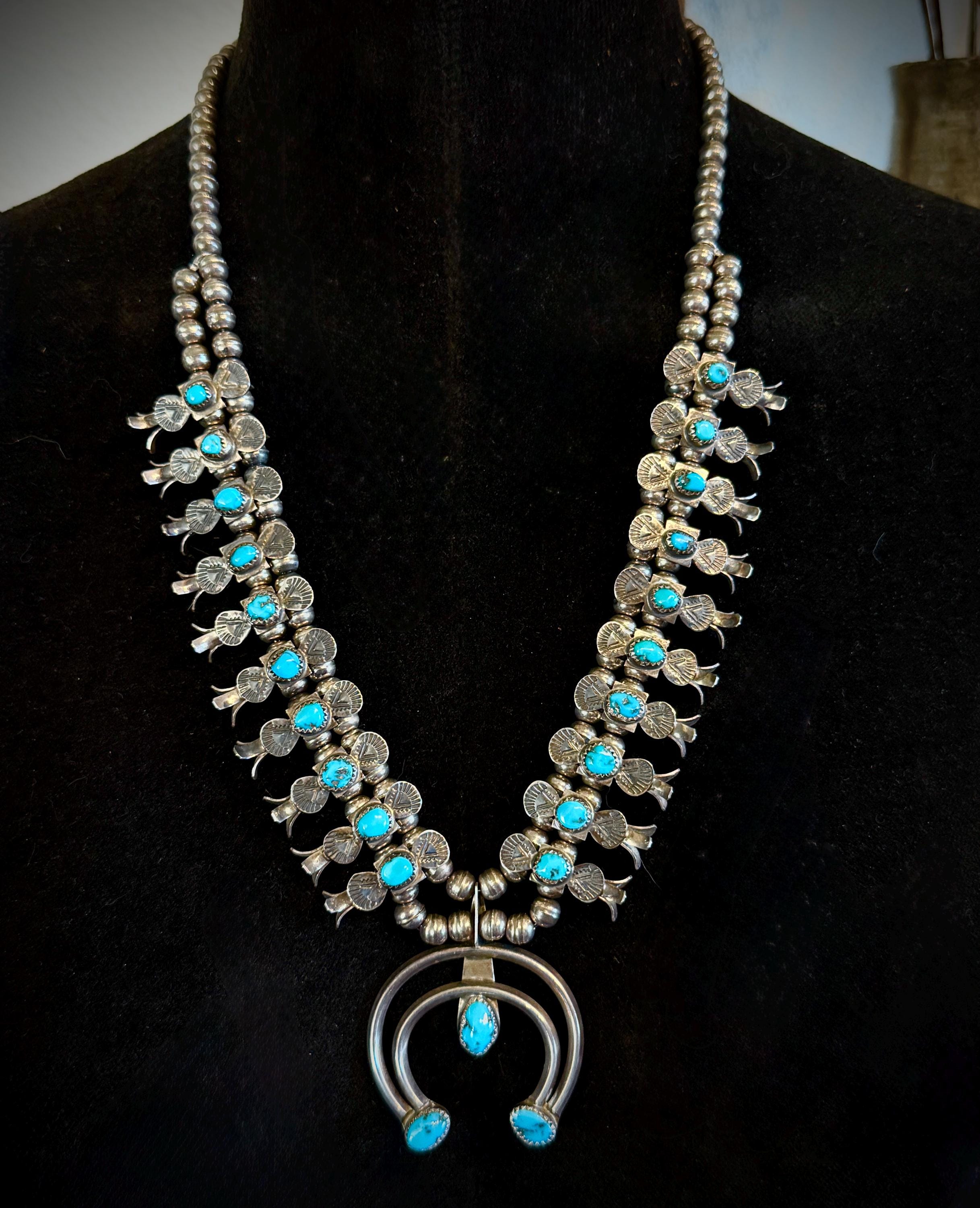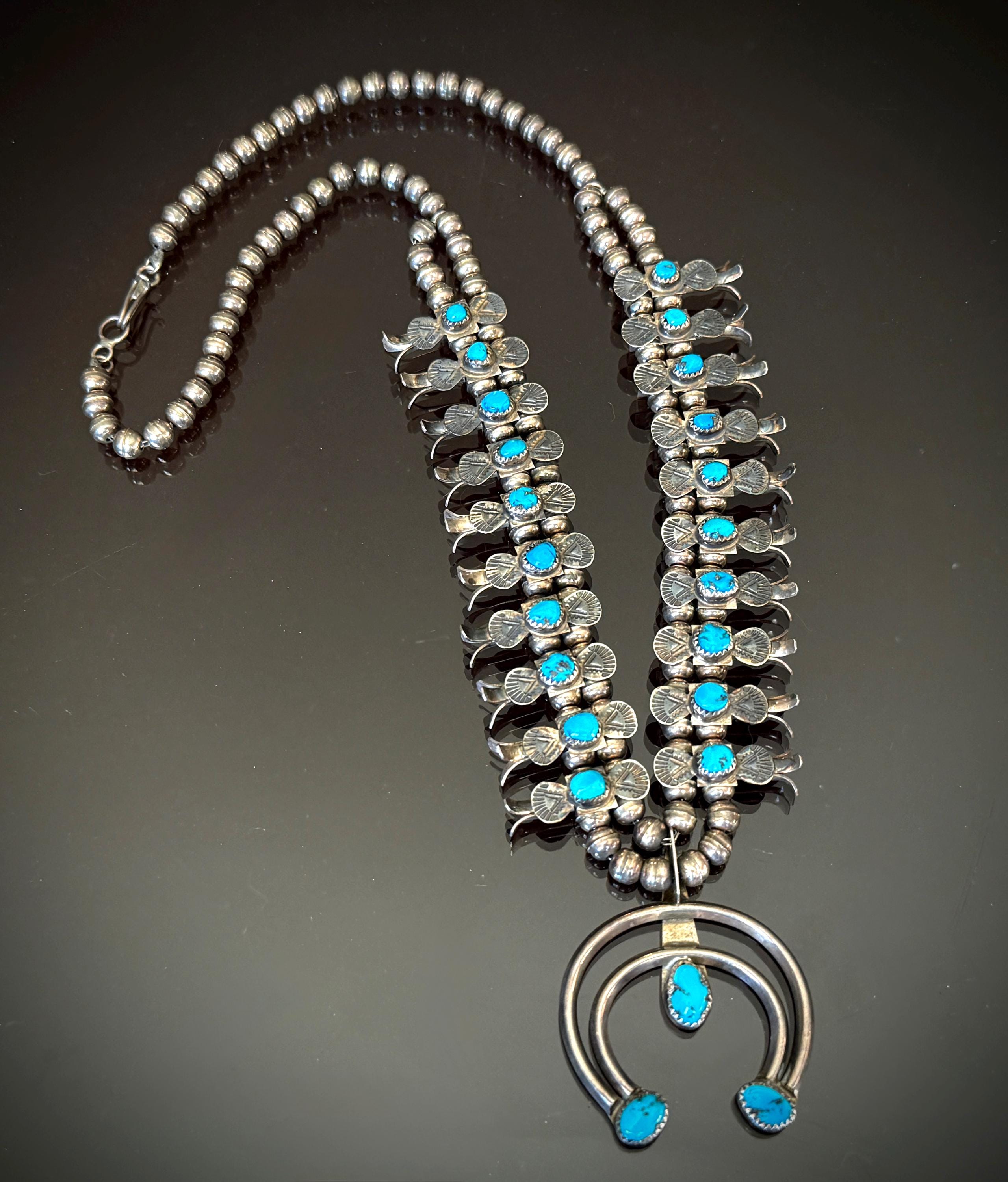 This squash blossom necklace is strung on silver chain with silver beads and 20 boxbow squash blossoms, each with a turquoise cabochon. The Naja (meaning Crescent) pendant has 3 oval turquoise stones and is a symbol of protection (encircling arms), and measures 2" X 1 3/4".