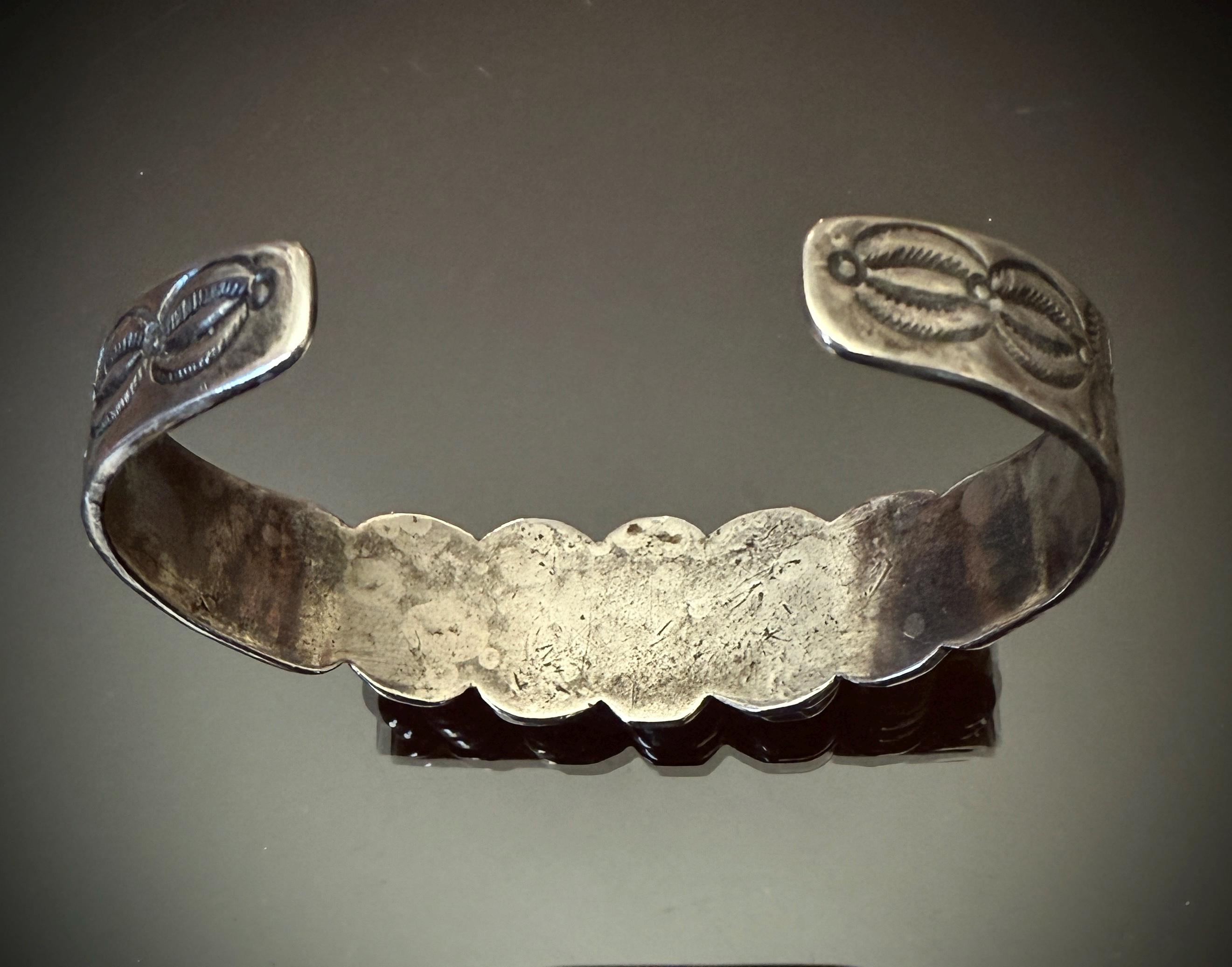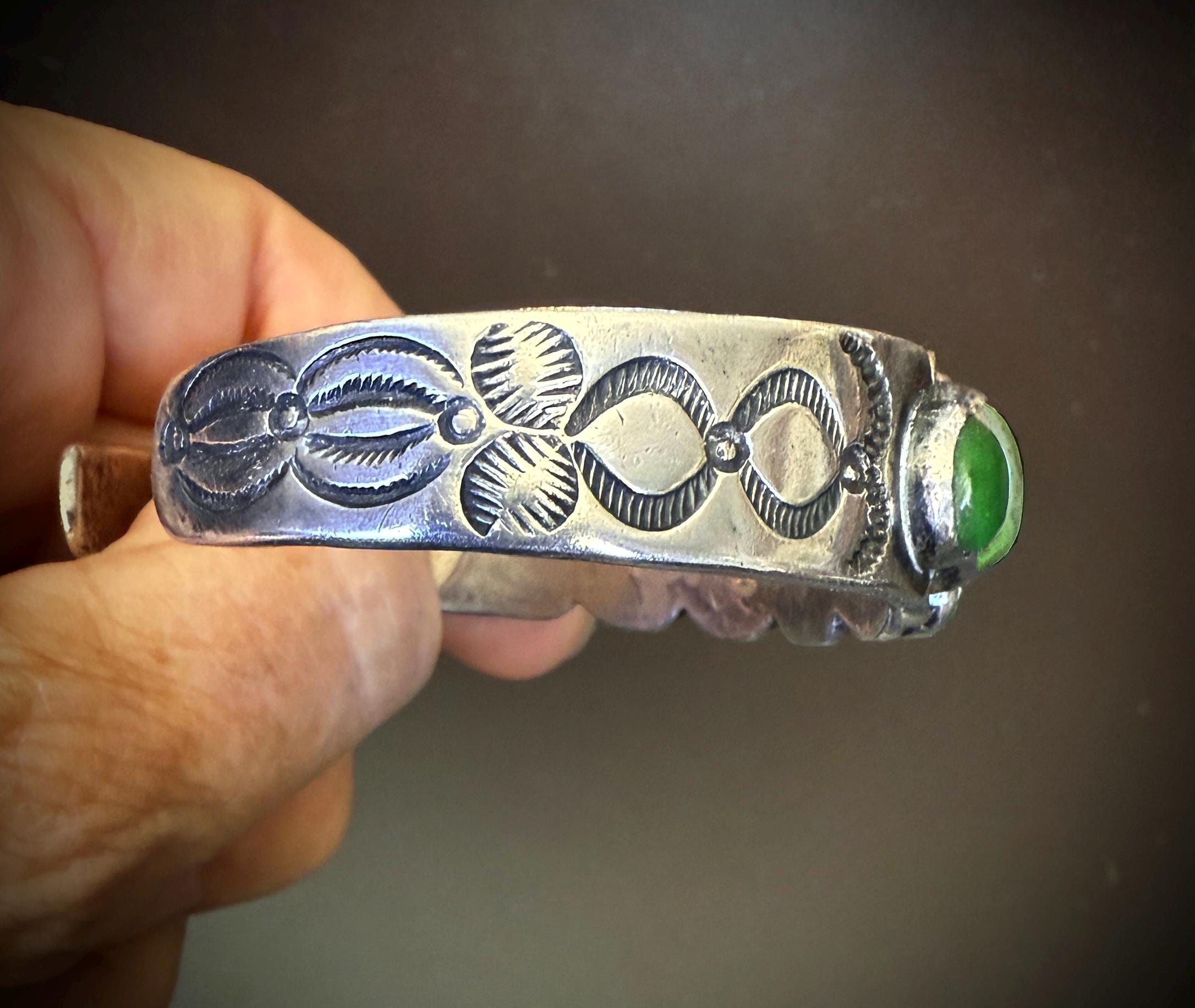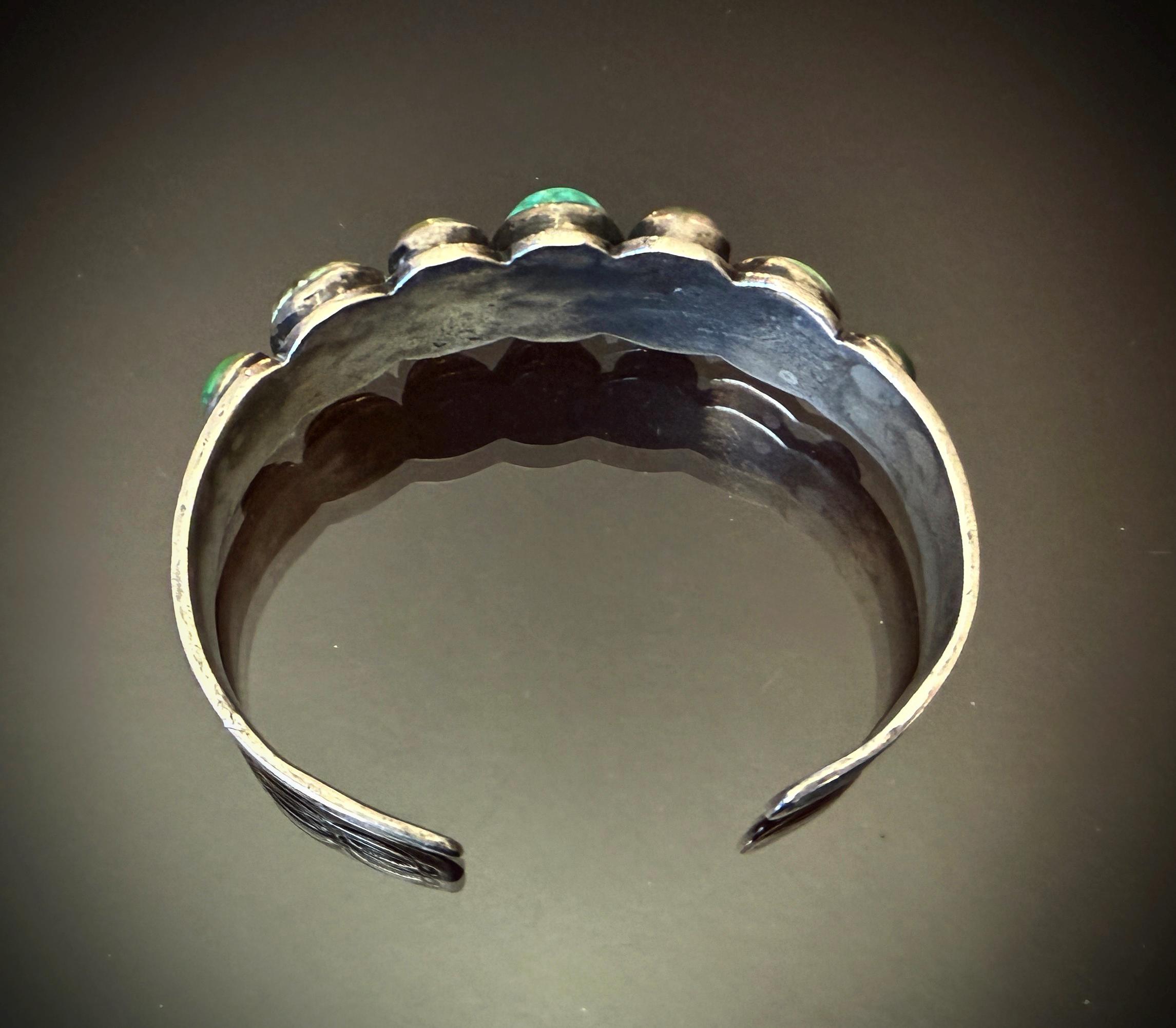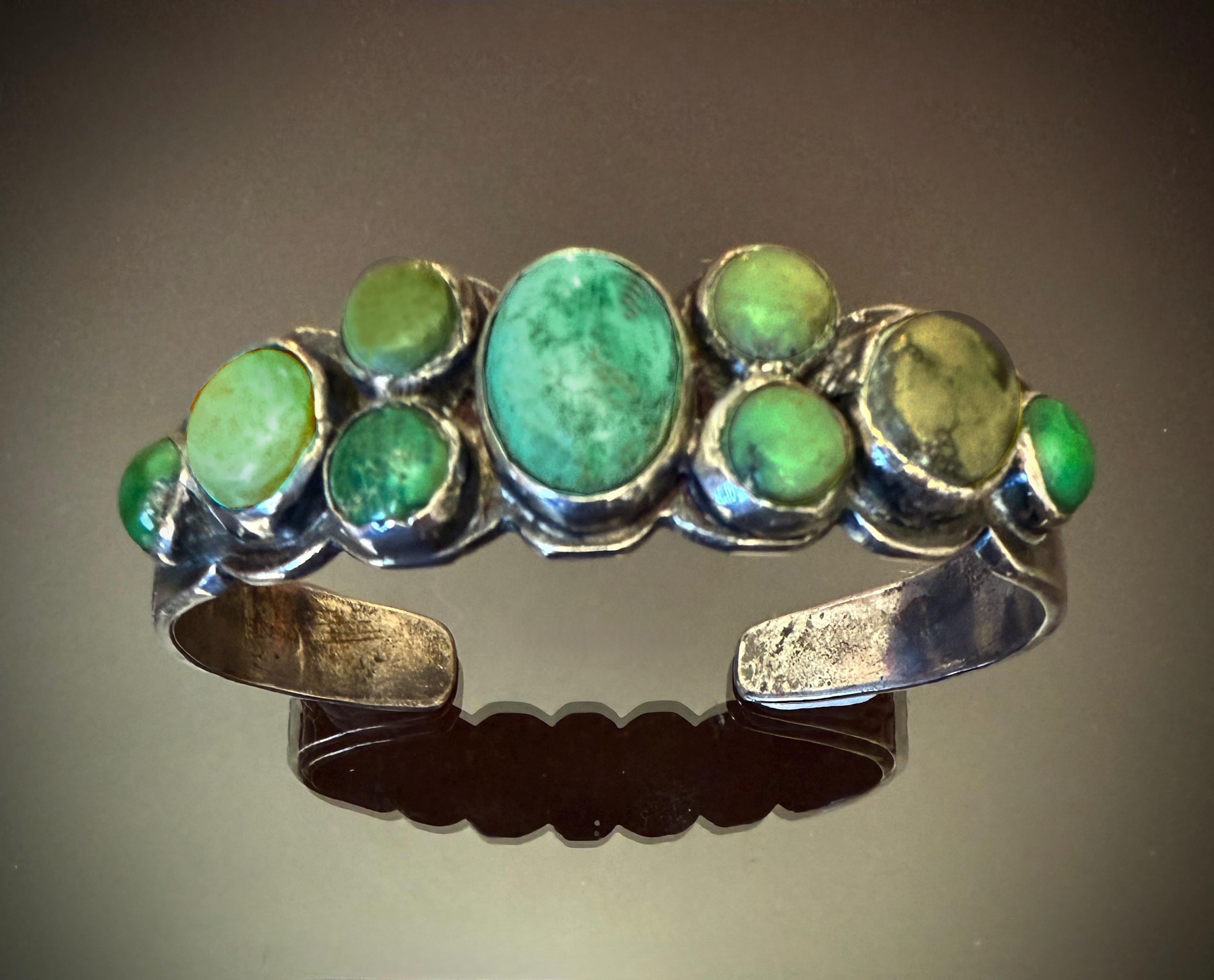 Hand hammered ingot silver cuff filed and chiseled to follow the shape of the stones. The 9 turquoise cabochons are various shades of green, some no doubt having changed shade with wear over the years. Hand stamped on sides to terminal ends. Weight, 50 grams.