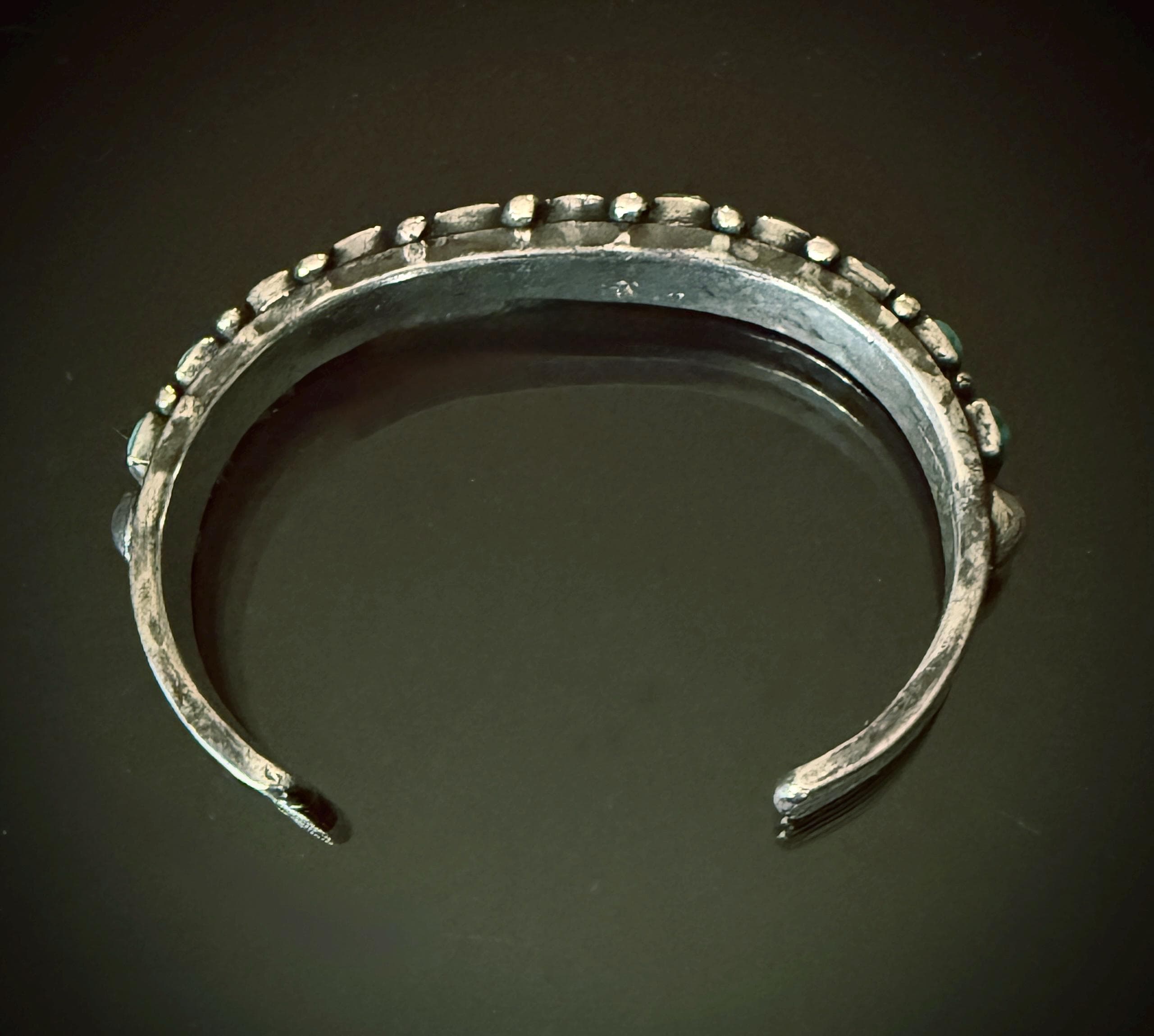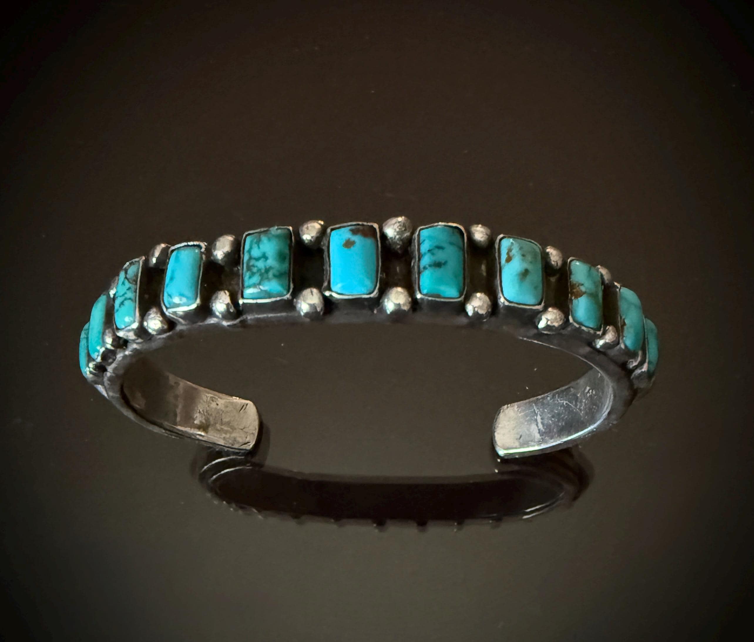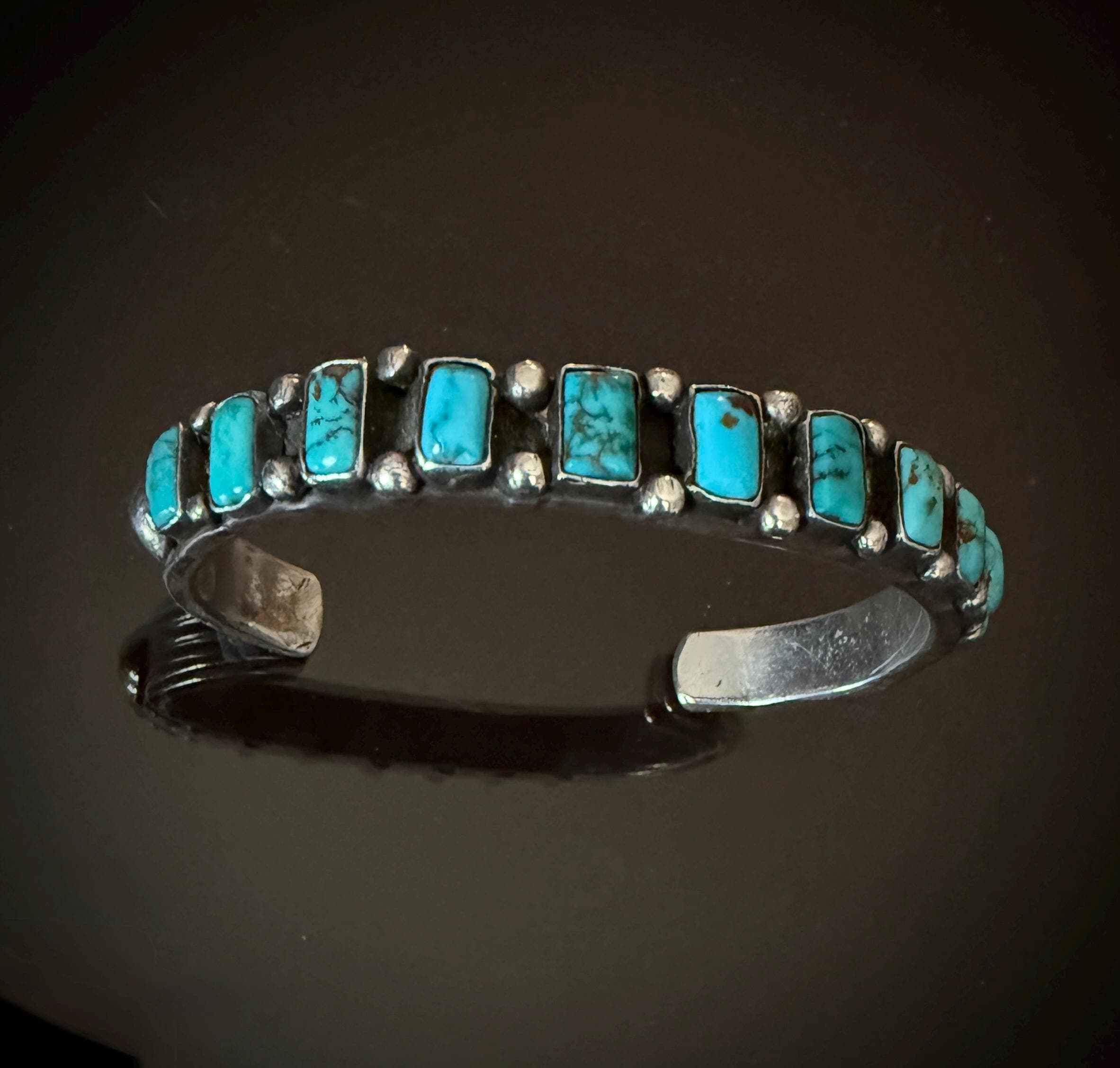 The 11 square cut turquoise cabochons on this bracelet are a beautiful blue! Mounted on a hand hammered narrow ingot cuff with chiseled ridges at the ends, and adorned with silver raindrops between stones with a large silver spot on each row end. Weight 46 grams