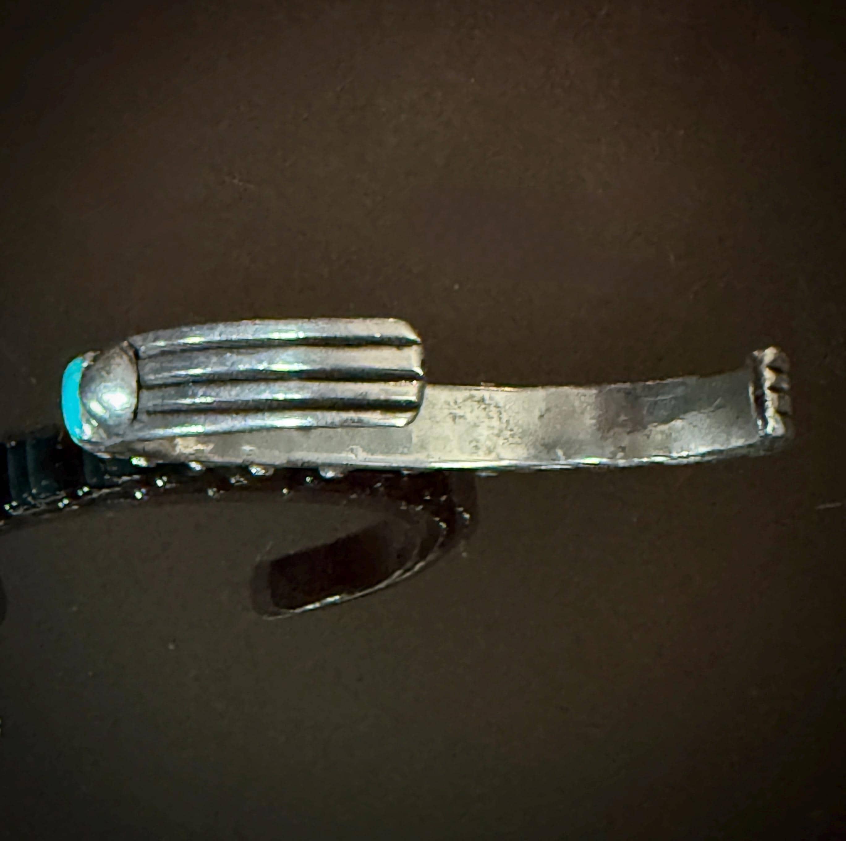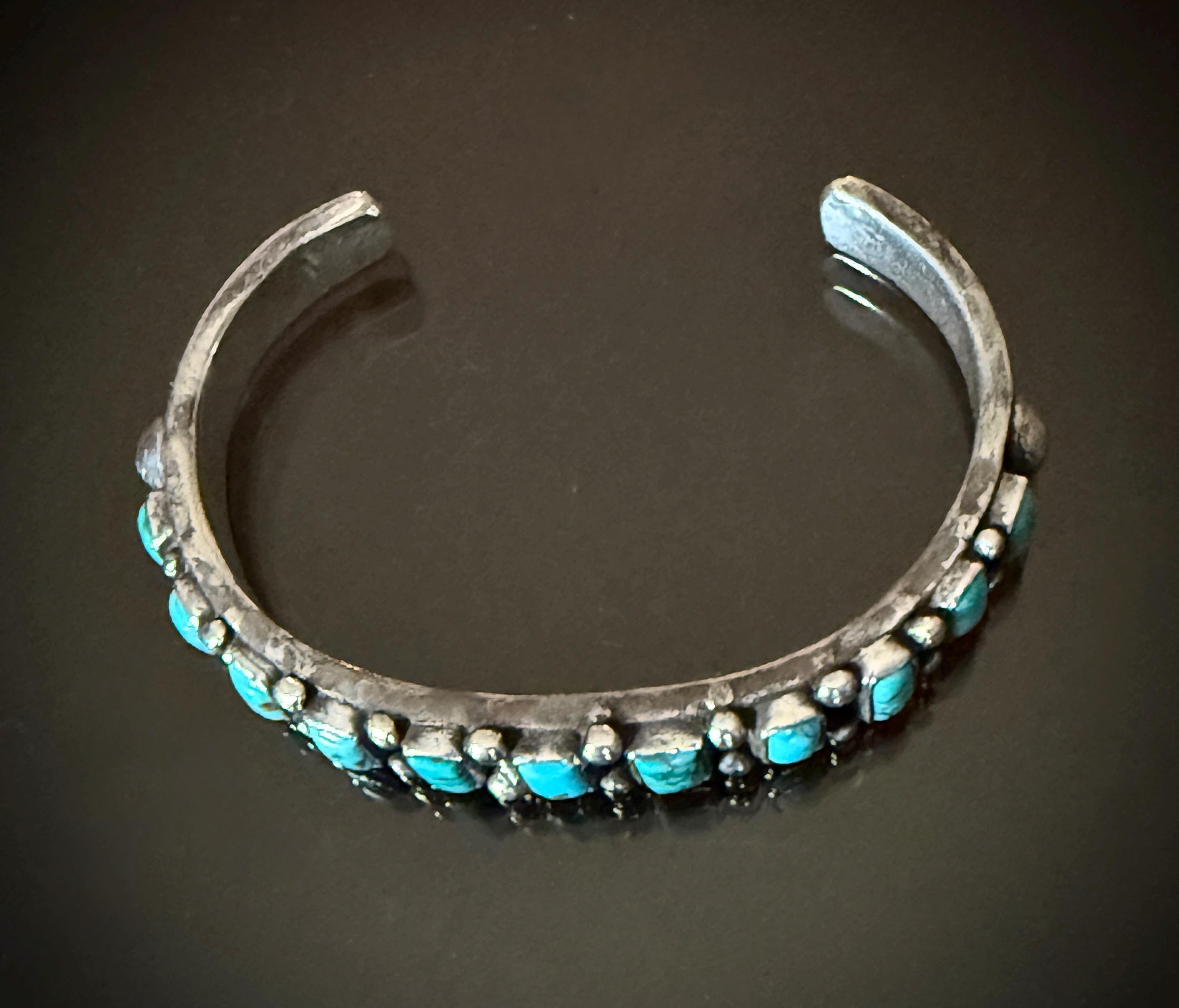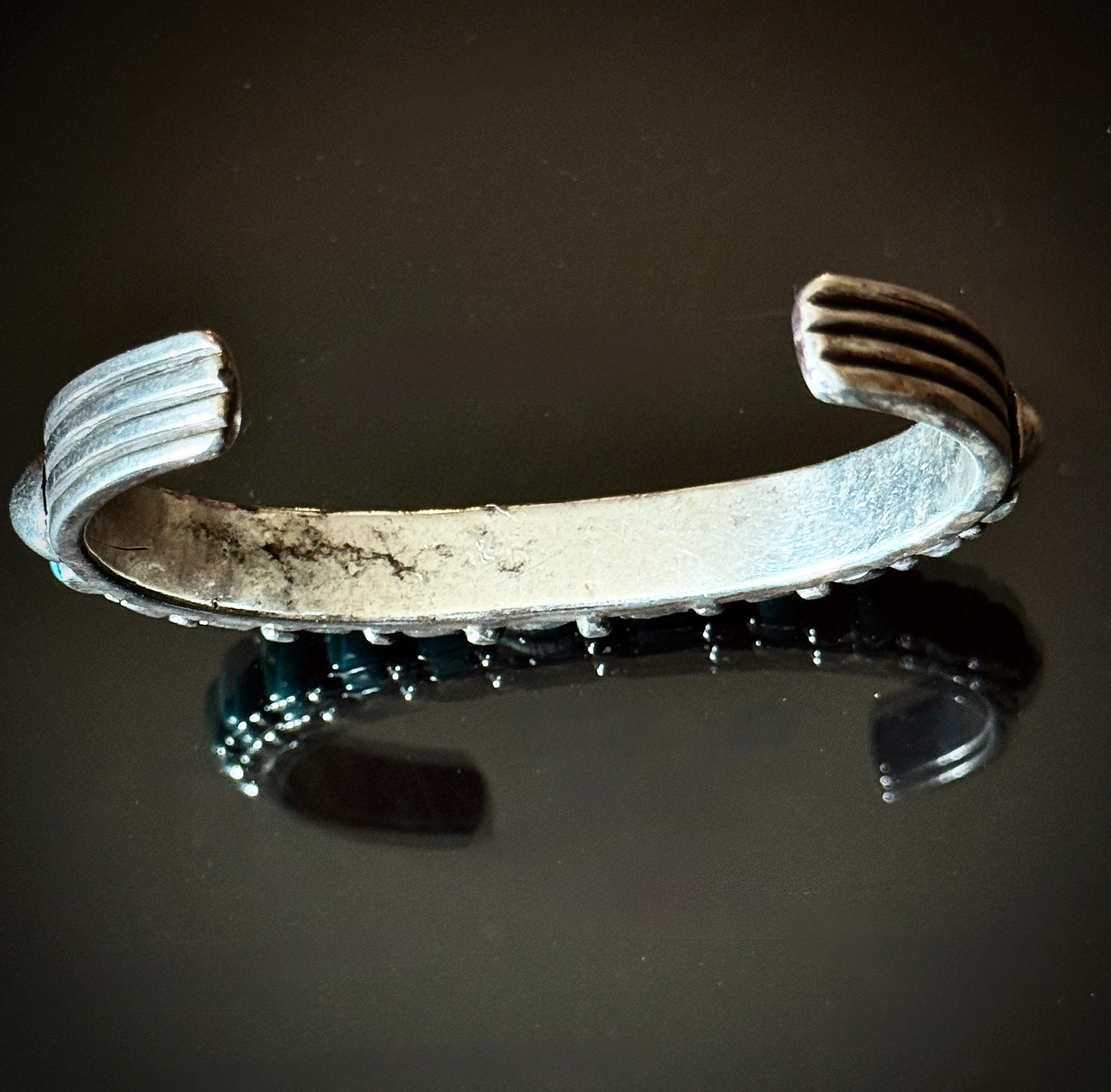 The 11 square cut turquoise cabochons on this bracelet are a beautiful blue! Mounted on a hand hammered narrow ingot cuff with chiseled ridges at the ends, and adorned with silver raindrops between stones with a large silver spot on each row end. Weight 46 grams