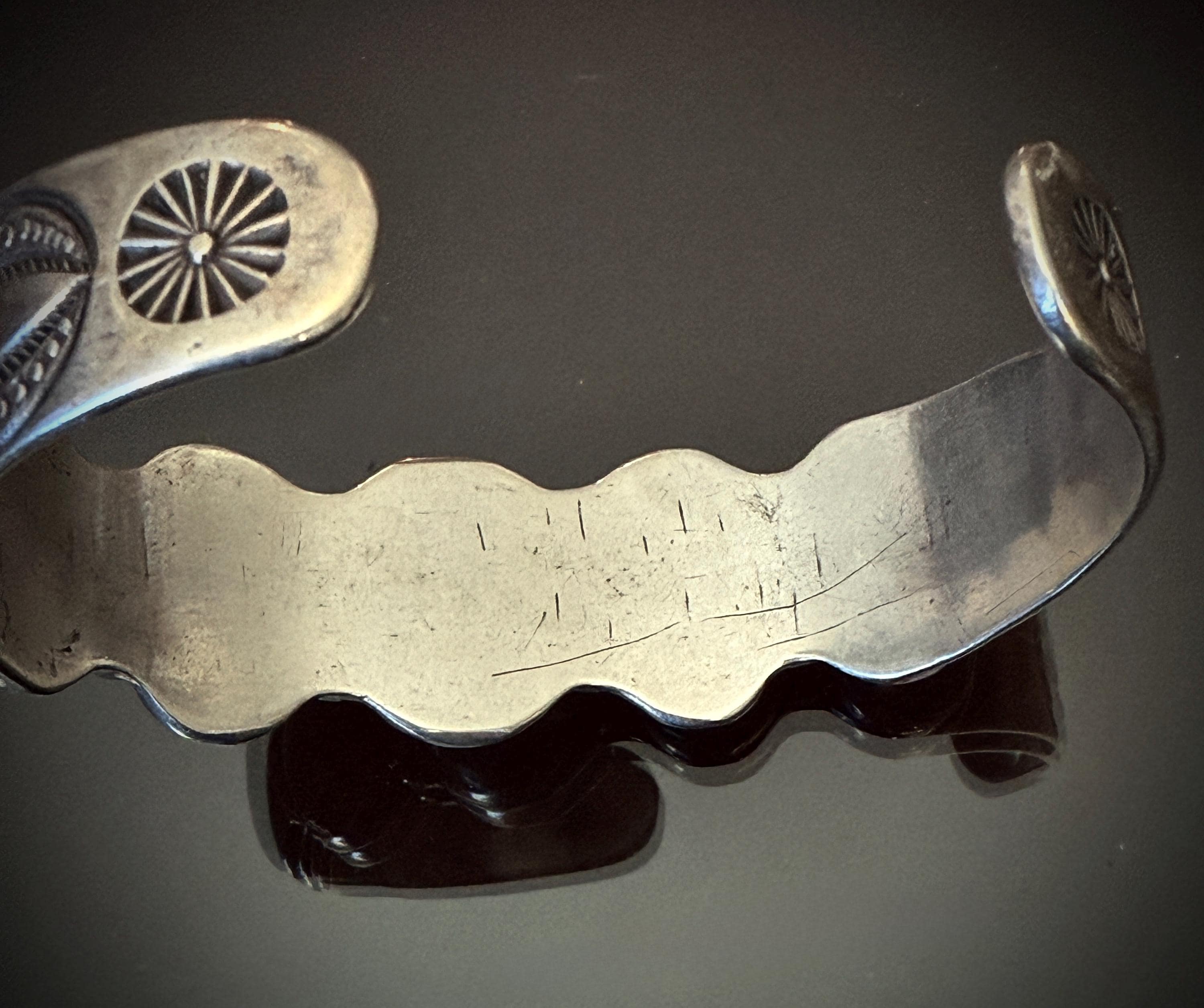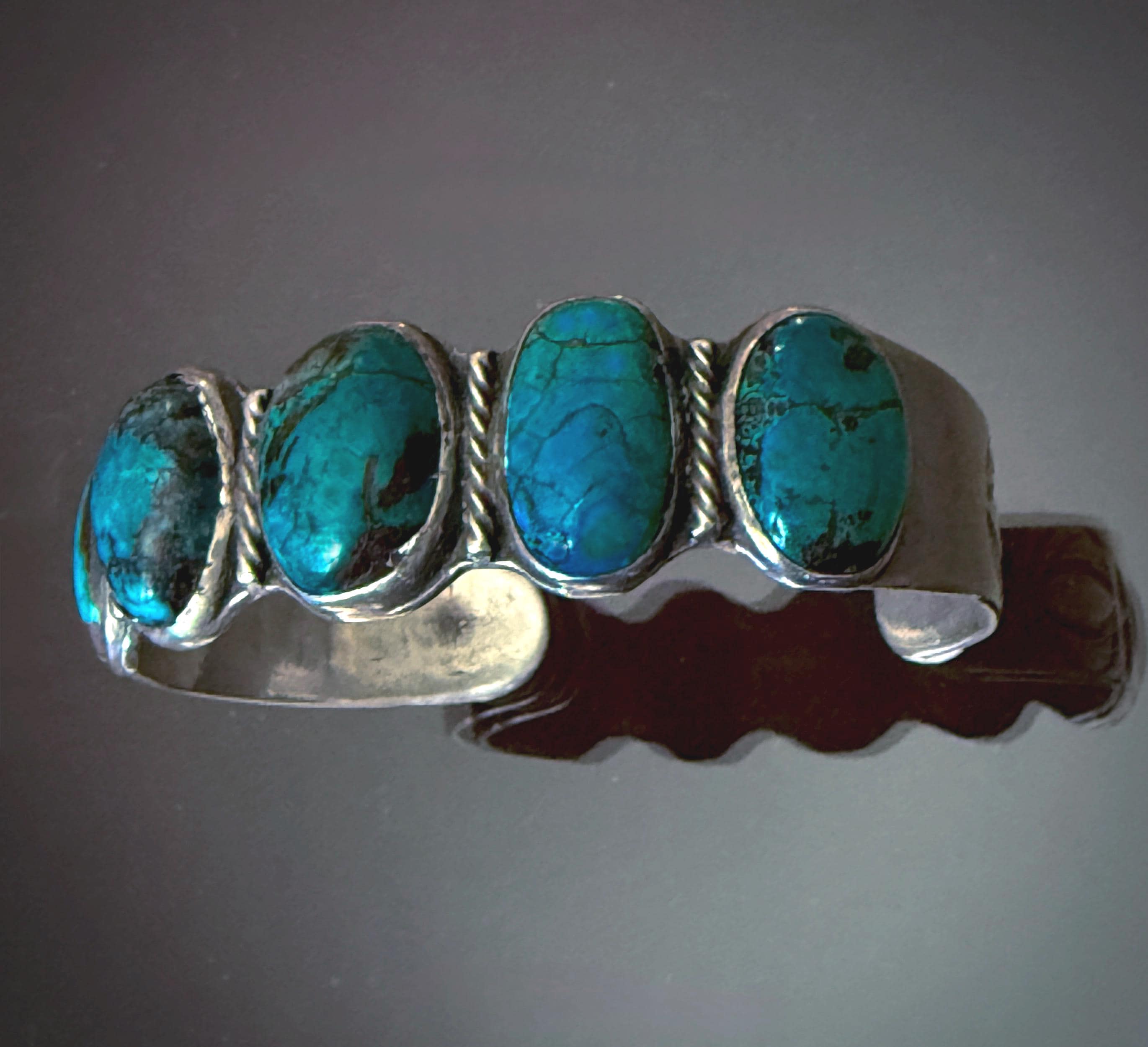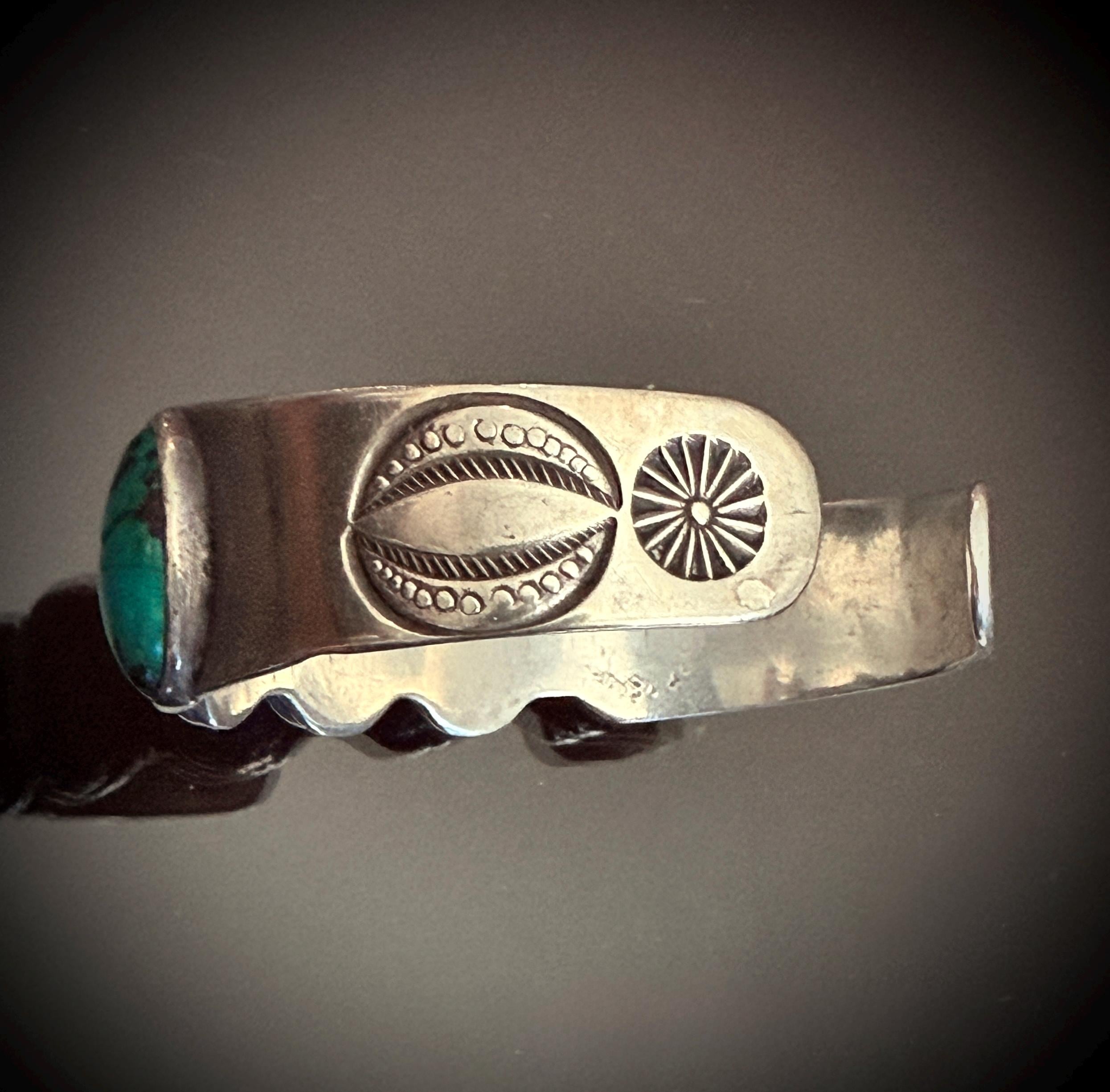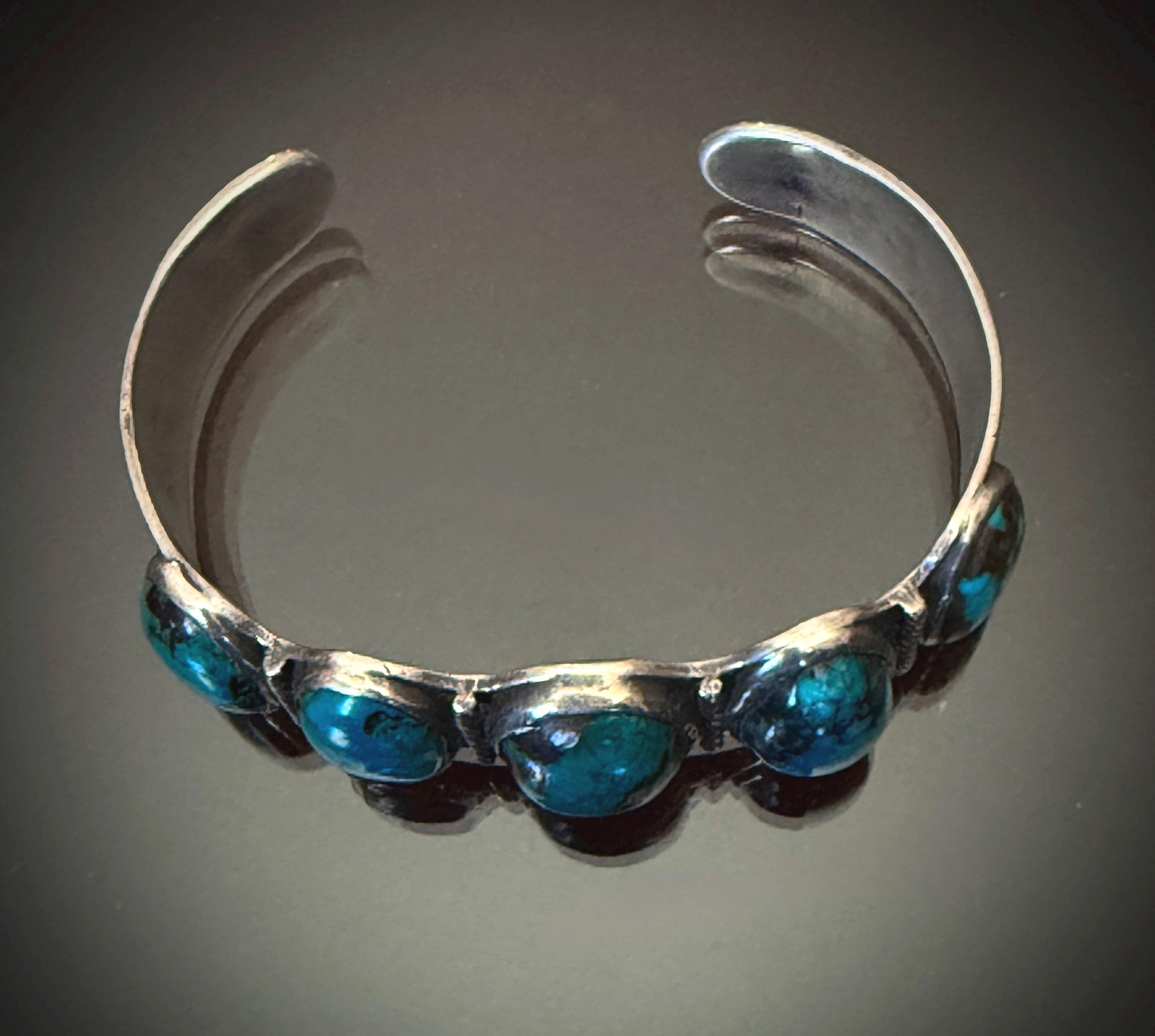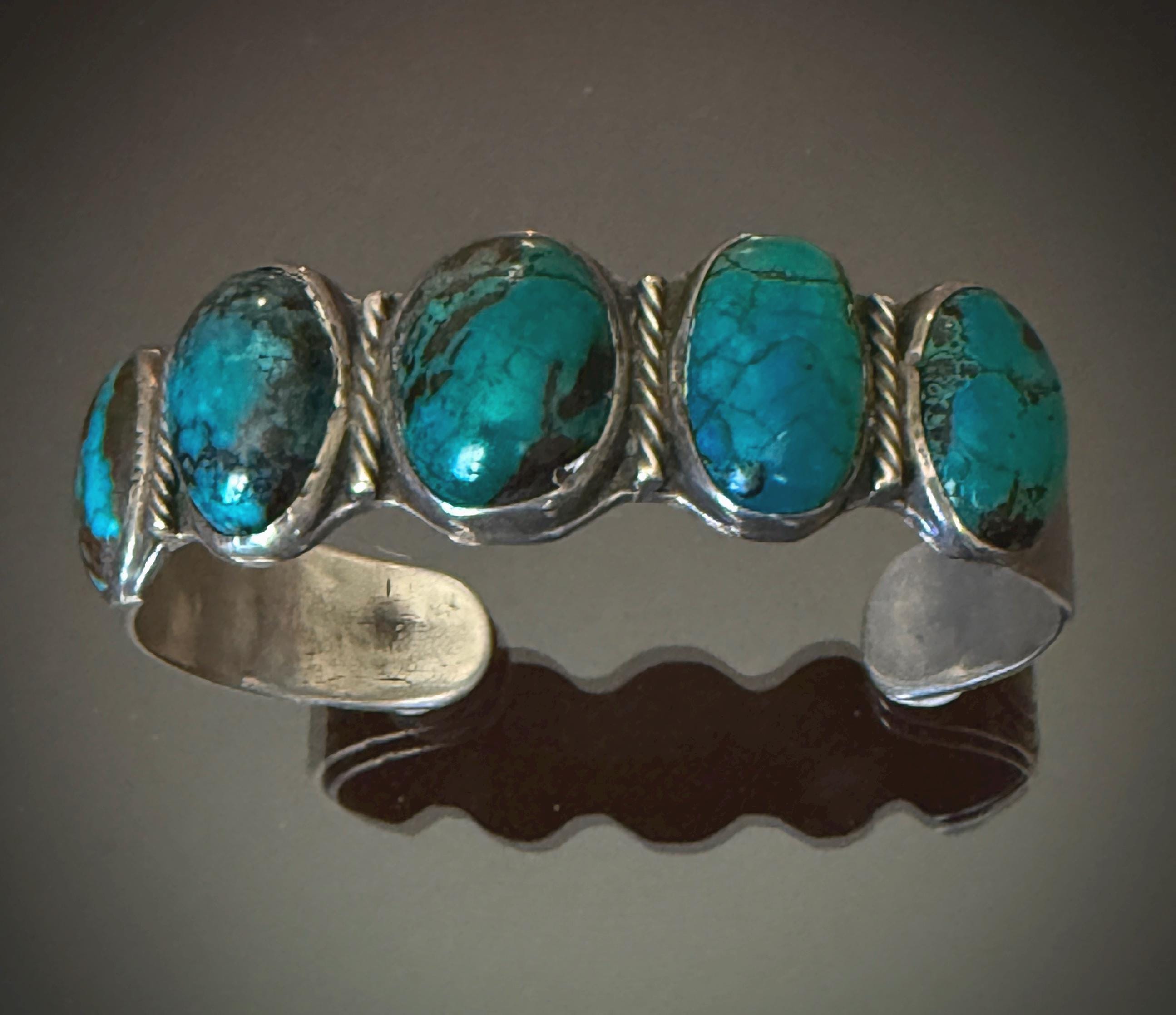 Really incredible dark blue turquoise cabochons on this 1930s-40s bracelet, each with high dome cut. Between each stone a twisted wire is set. The sides are hand stamped, with a starburst stamp on the terminals. Lots of wear, with some cracking to a few of the stones, but all very stable.
