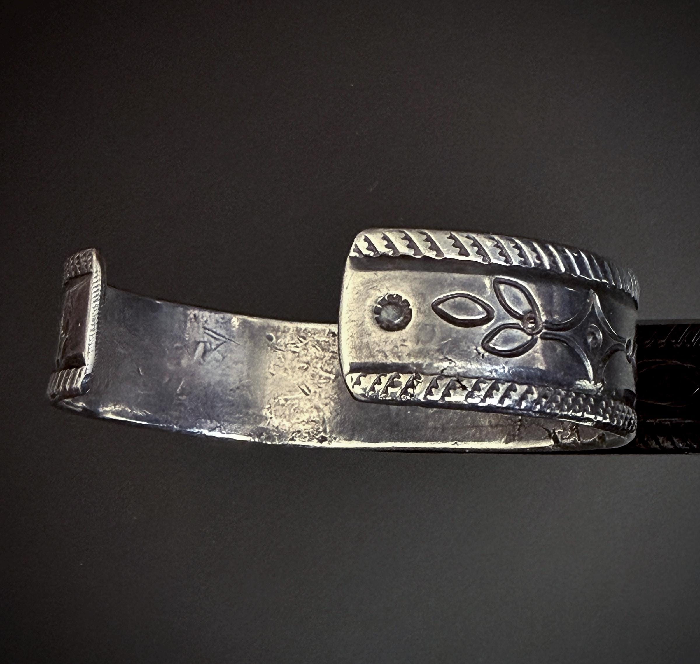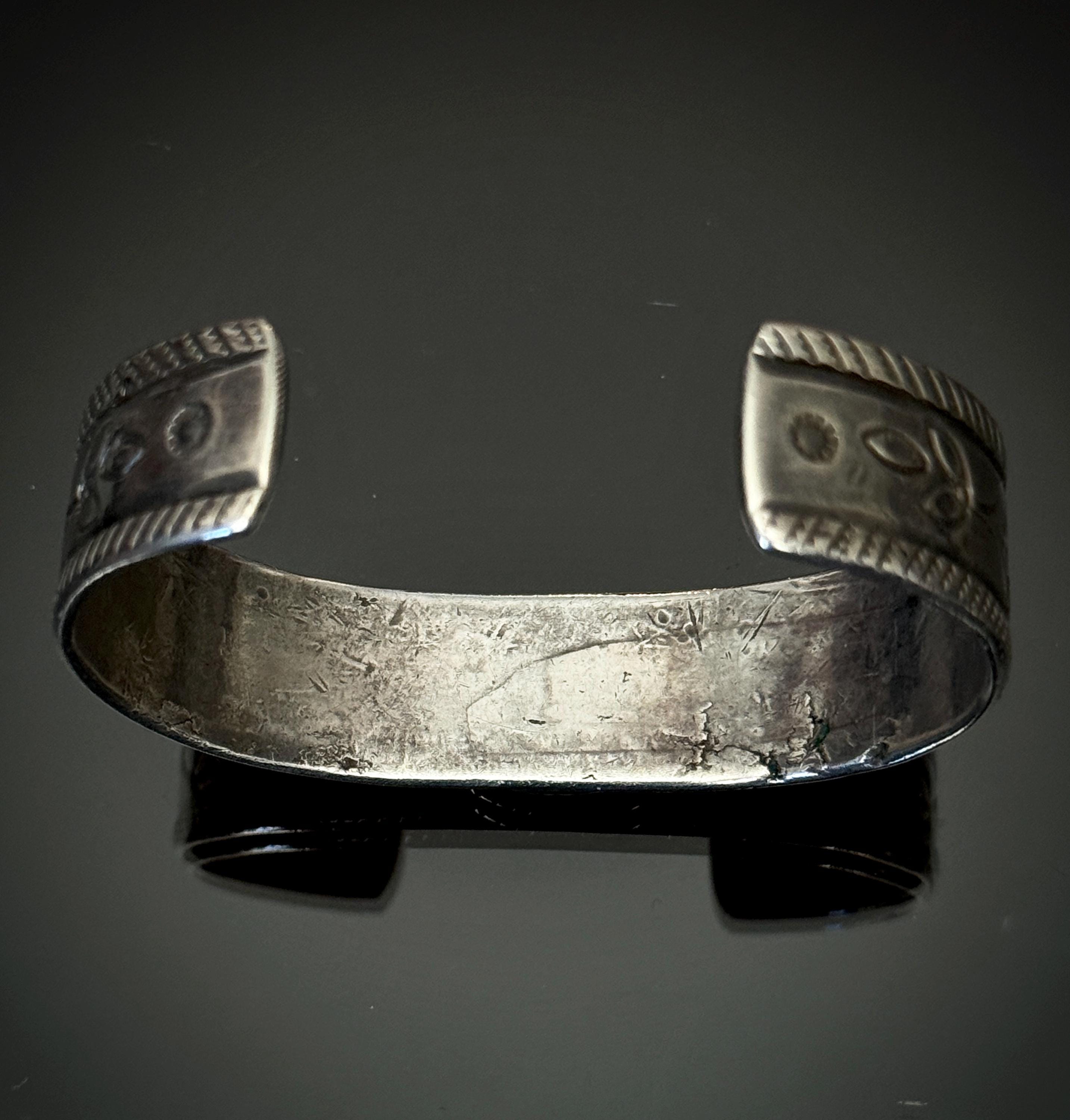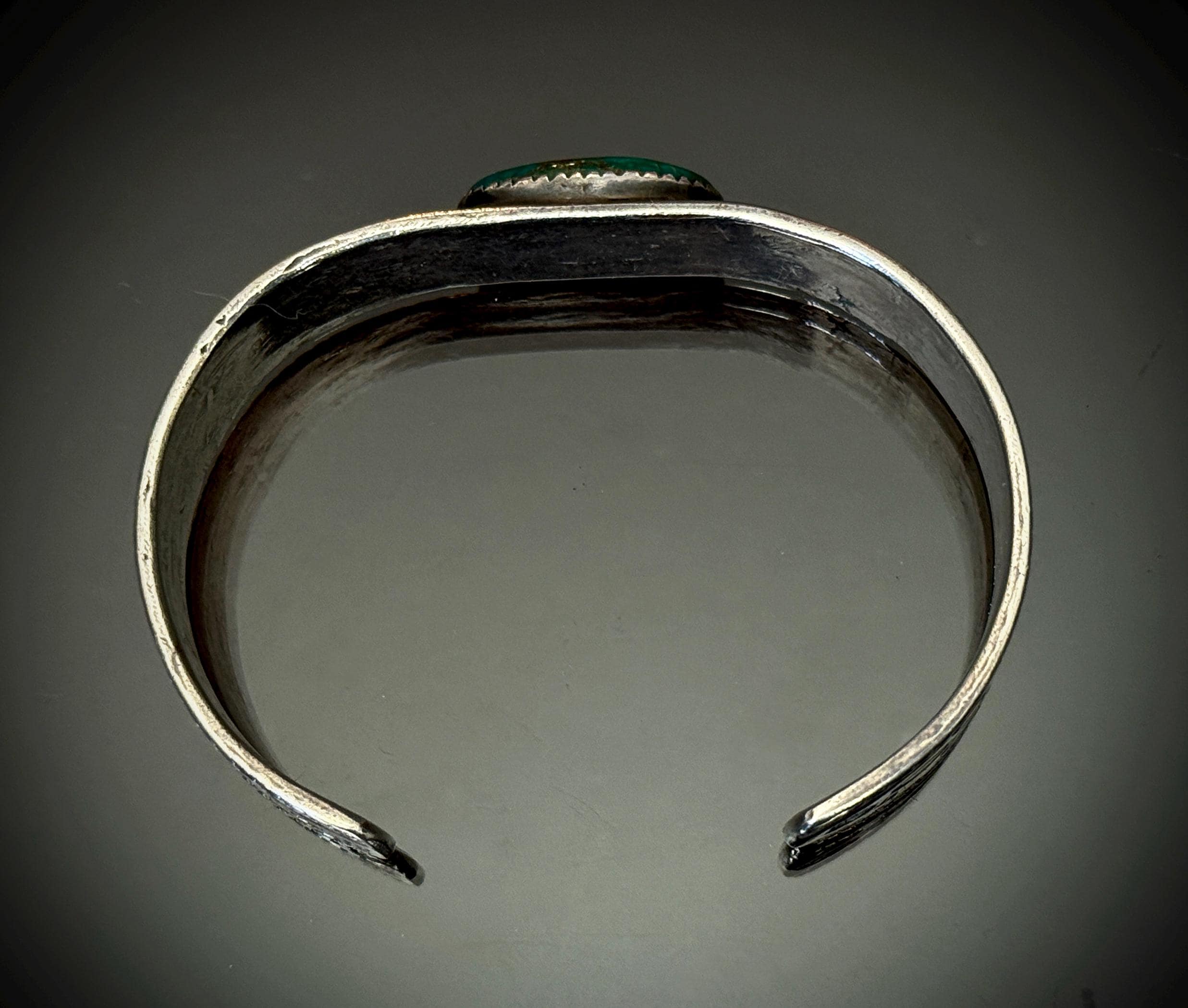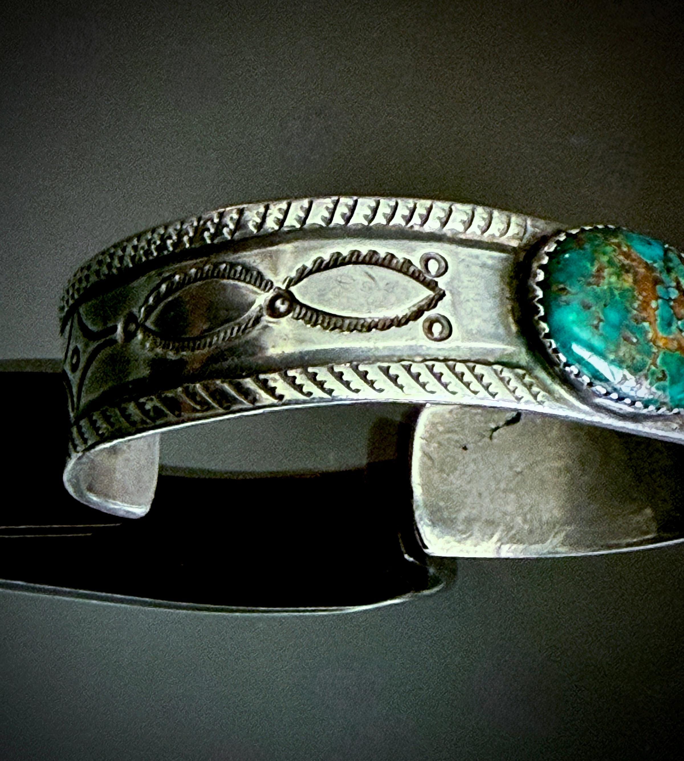 Deep blue-green turquoise cabochon in a sawtooth bezel set on a band that is made of hand hammered ingot silver. It has chiseled borders with serrated line stamping along it's beautifully worn edges. Along the center is stamping which includes circles, pointed ovals, star shapes, and leaf-like stamping at the ends. Circa 1900-1920. Weight is 42 grams.
