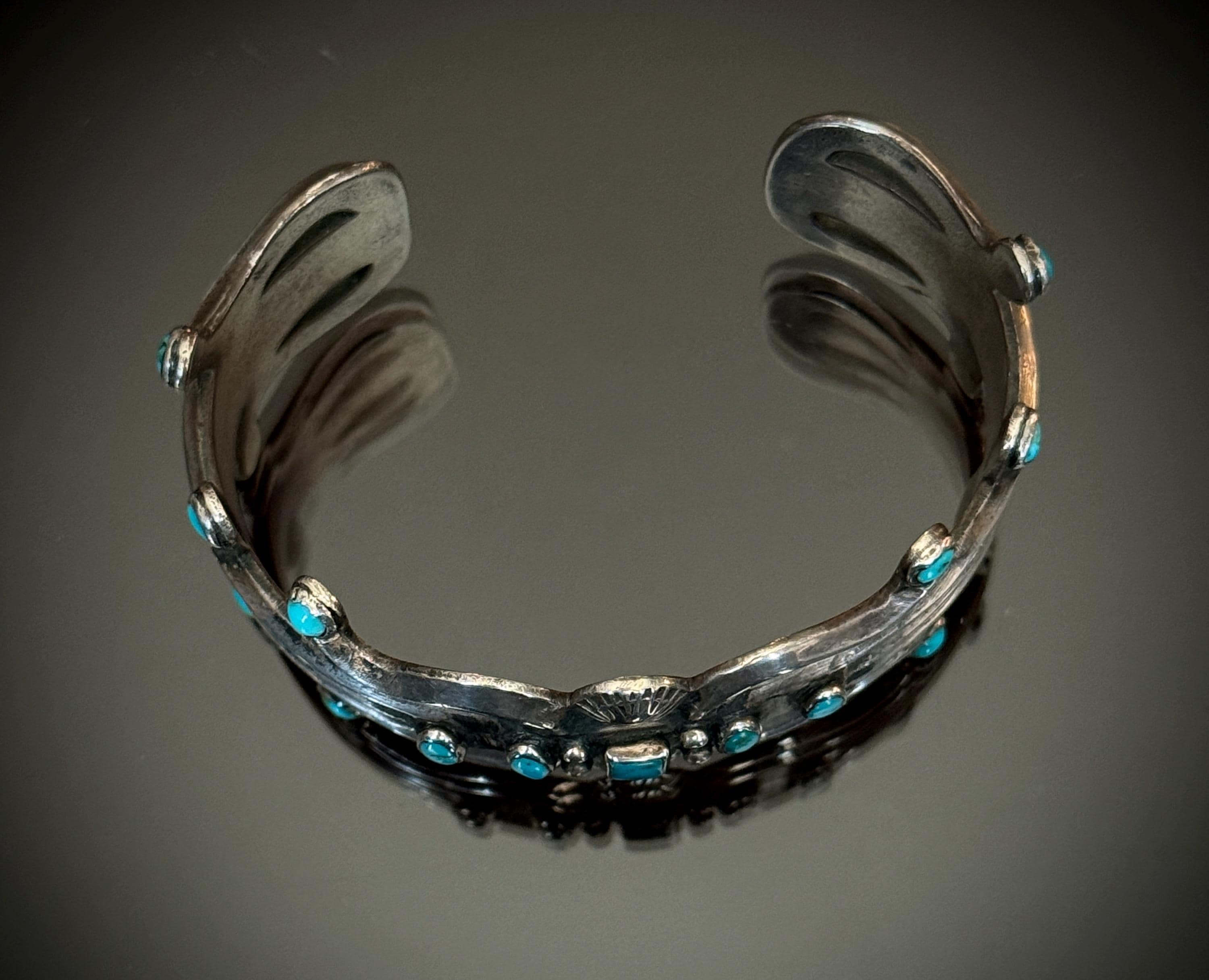 This is one of the designs unique to Juan De Dios, and is the best example I have seen. There are 17 turquoise stones in all. The central rectangular turquoise cabochon is flanked by 2 oval cabs on each side. The central section looks like 3 carinated bands, and the scrolling ornamentation both on the ends and center look like harps with small round turquoise stones on the ends. There are several variations of this design that I've seen in my research. This piece dates to the 1920s.