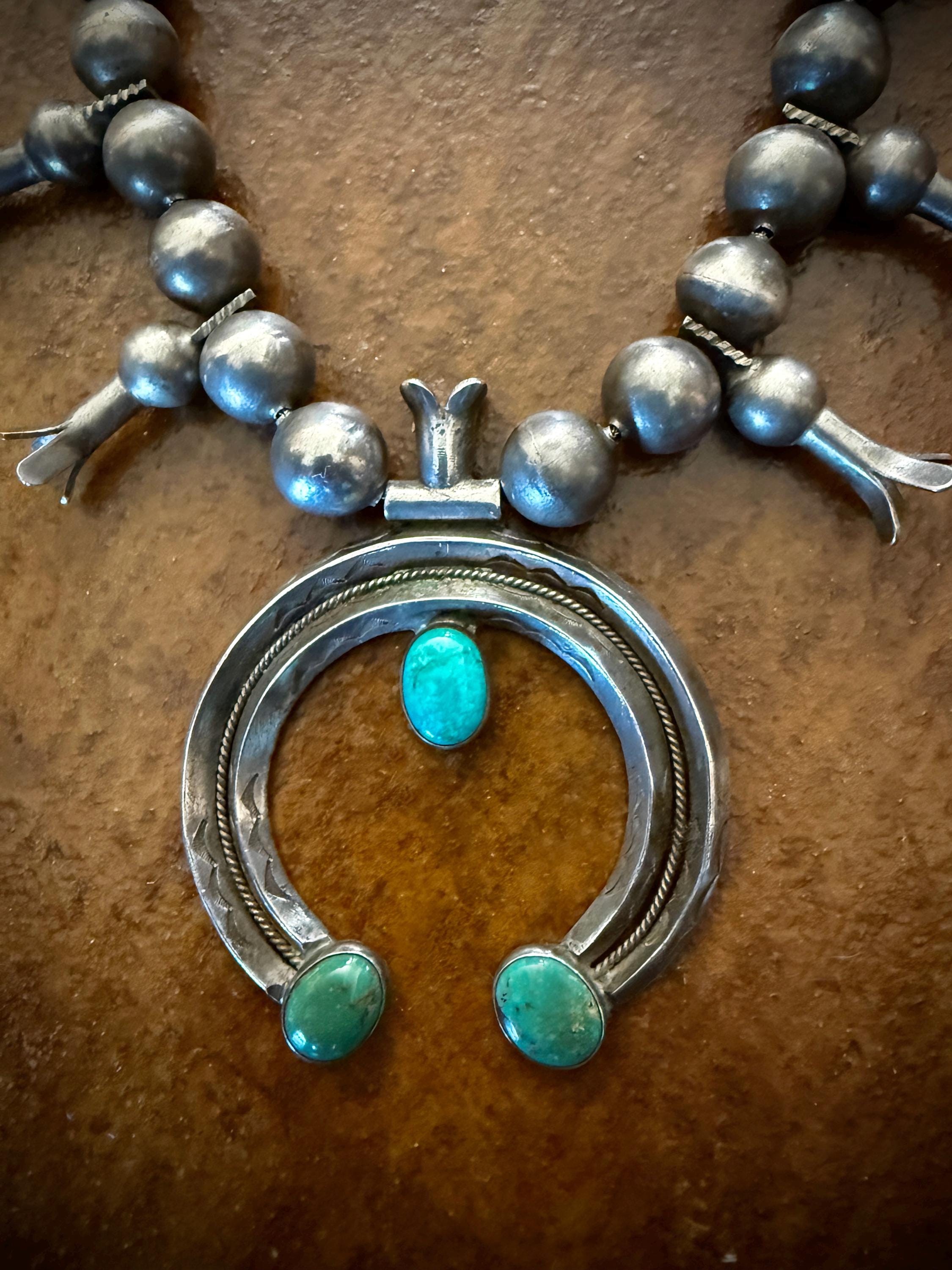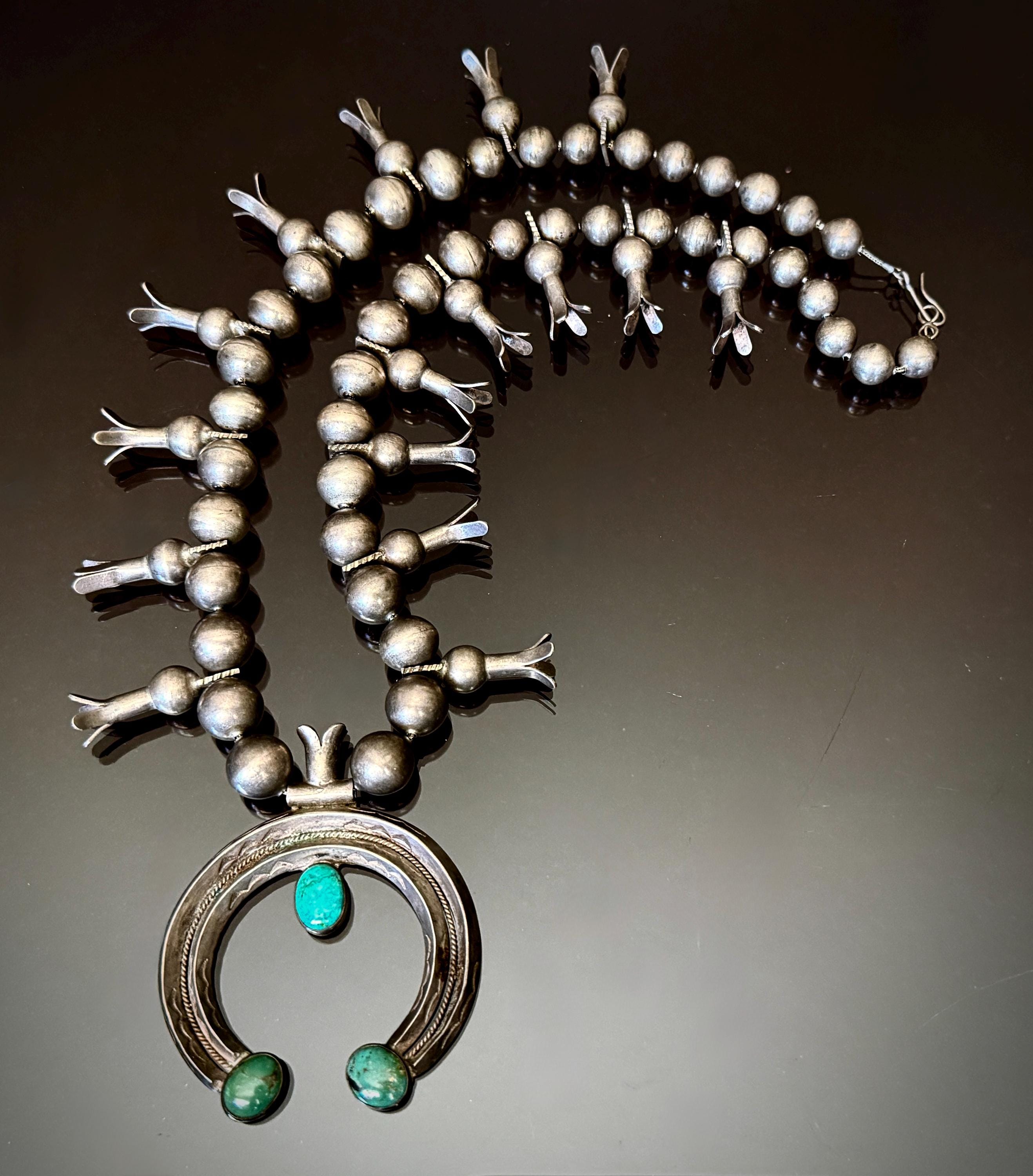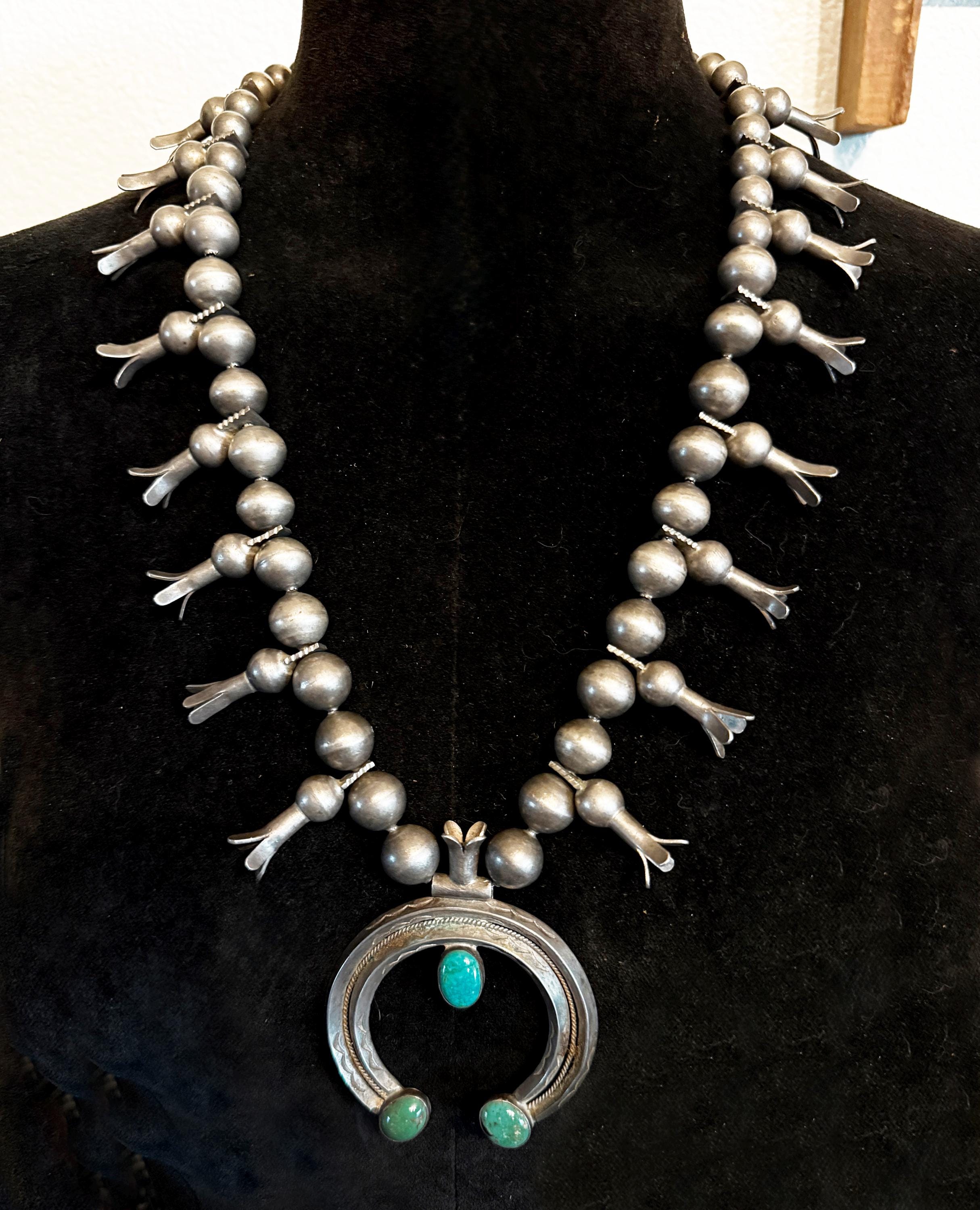 Early 20th century Squash Blossom Necklace with 16 blossoms, and beautifully hand made thick gauge silver beads. The double carinated Naja has three oval turquoise cabochons, two green and one blue-green. Over all length 26" with a hook clasp, strung on braided wire. Naja height: 3" Width: 2 1/2" Weight: 200 grams