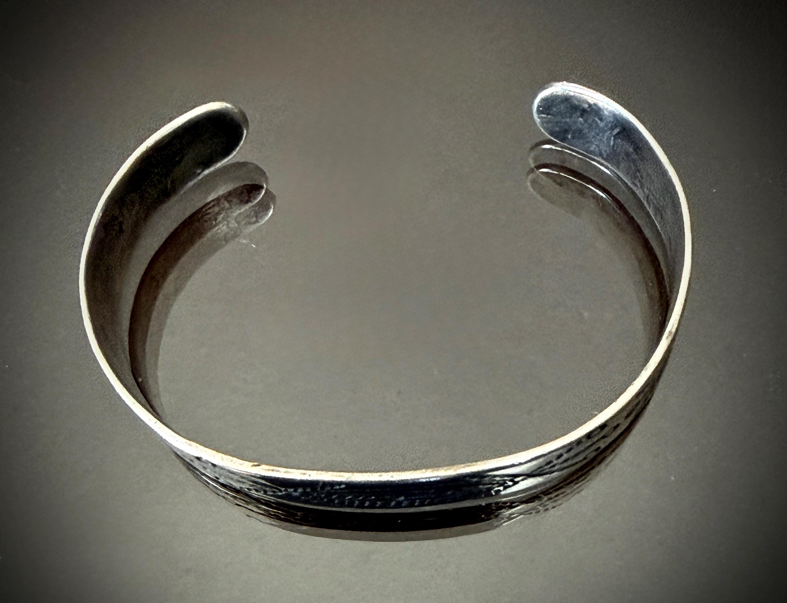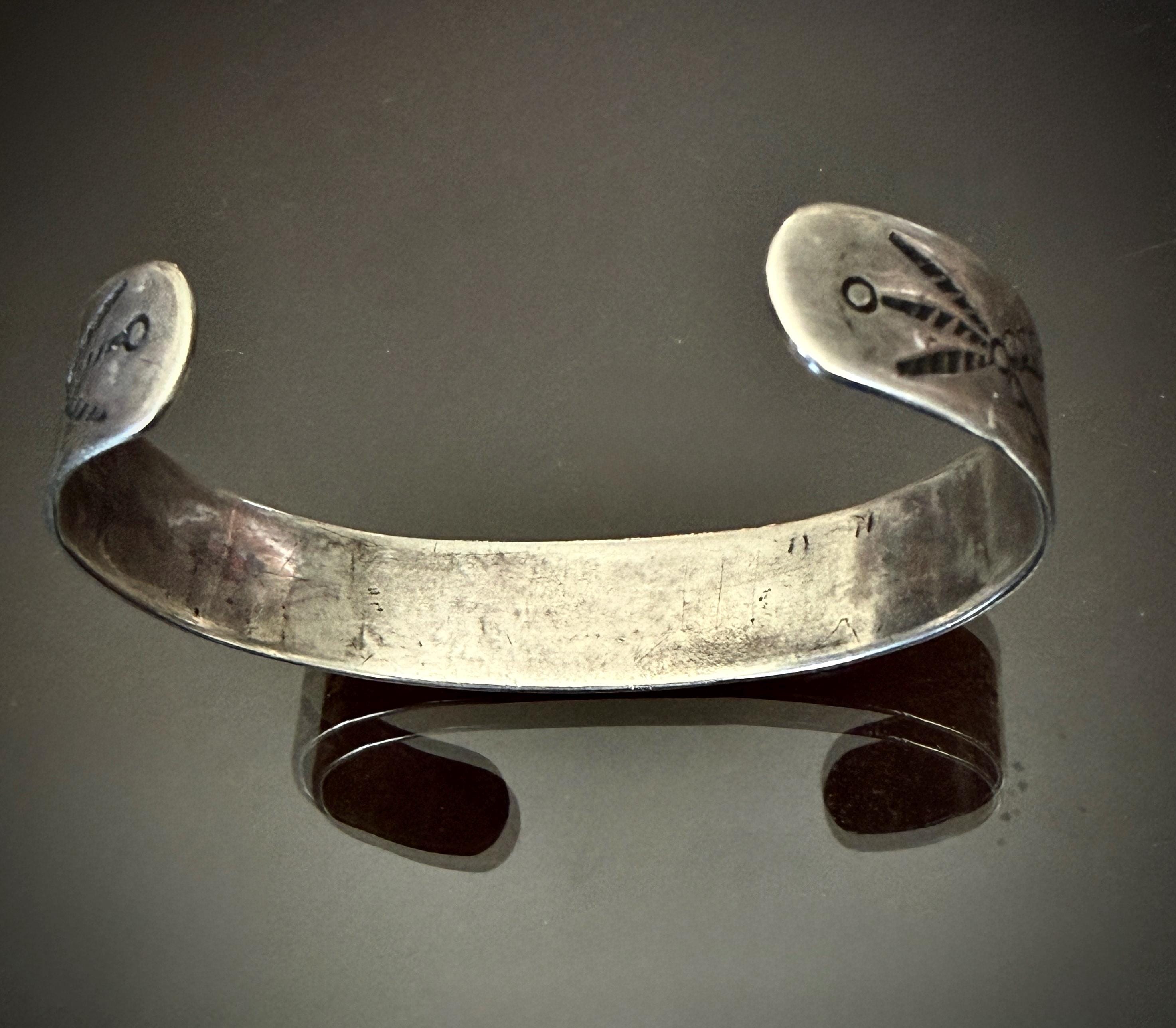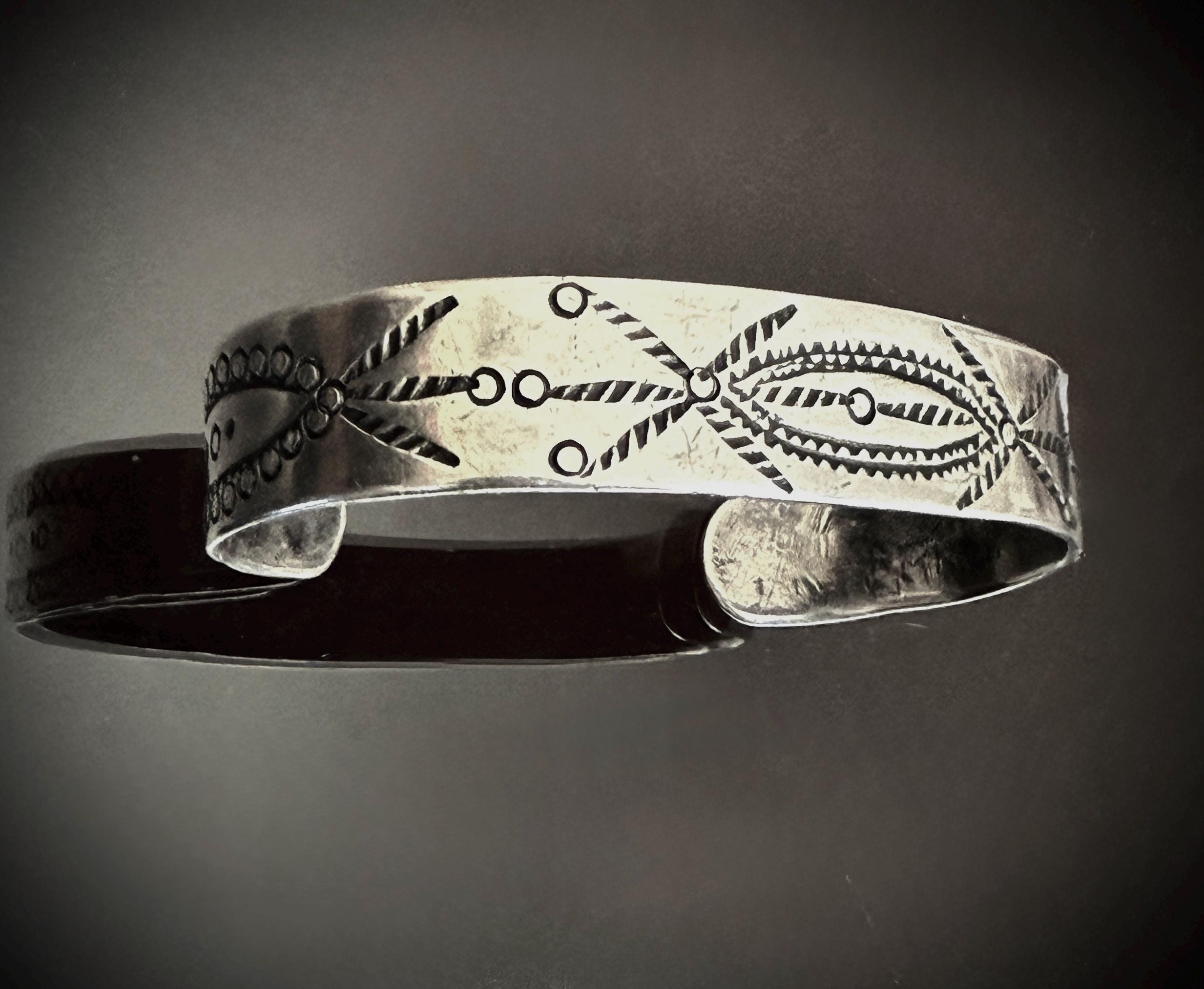 This is a great example of a simple silver ingot cuff from the late 19th or early 20 century. It's decorated with available tools, such as a chisel, a punch, and a crude hand made arched stamp with serrated edges. The silversmith used only 20 grams of silver for this one, but it is a beauty!