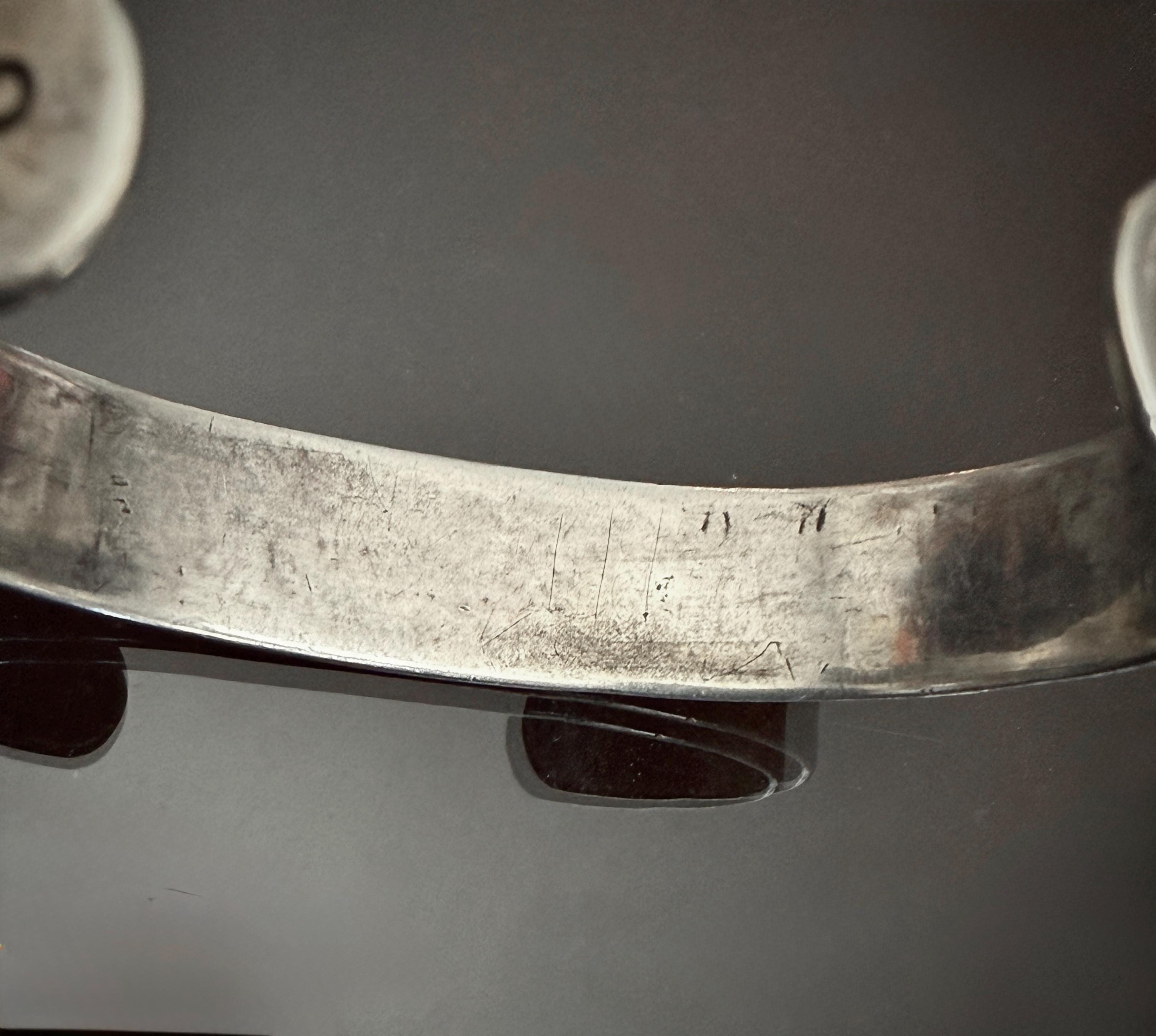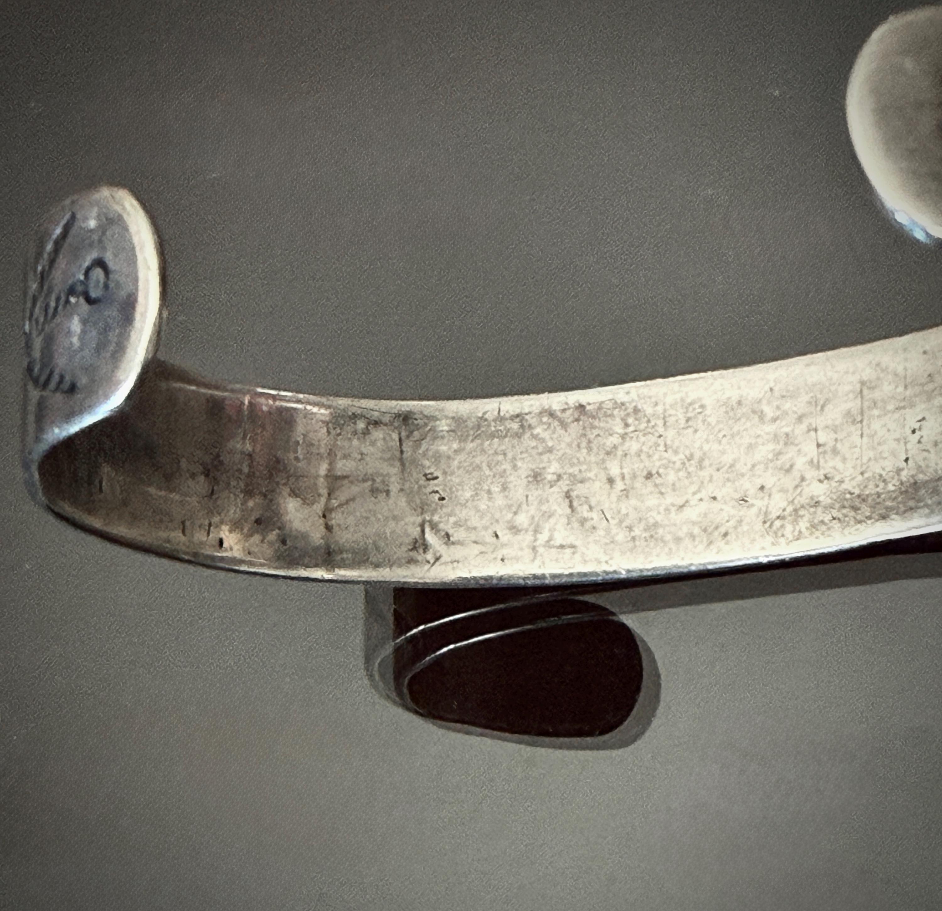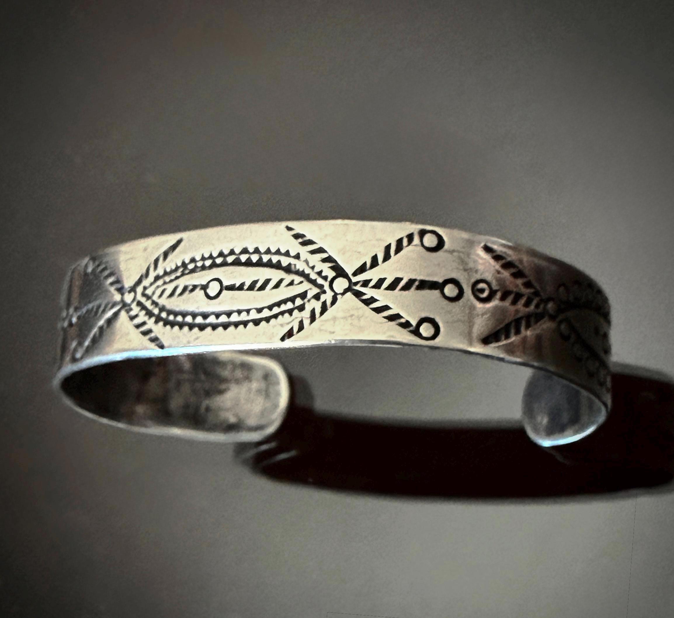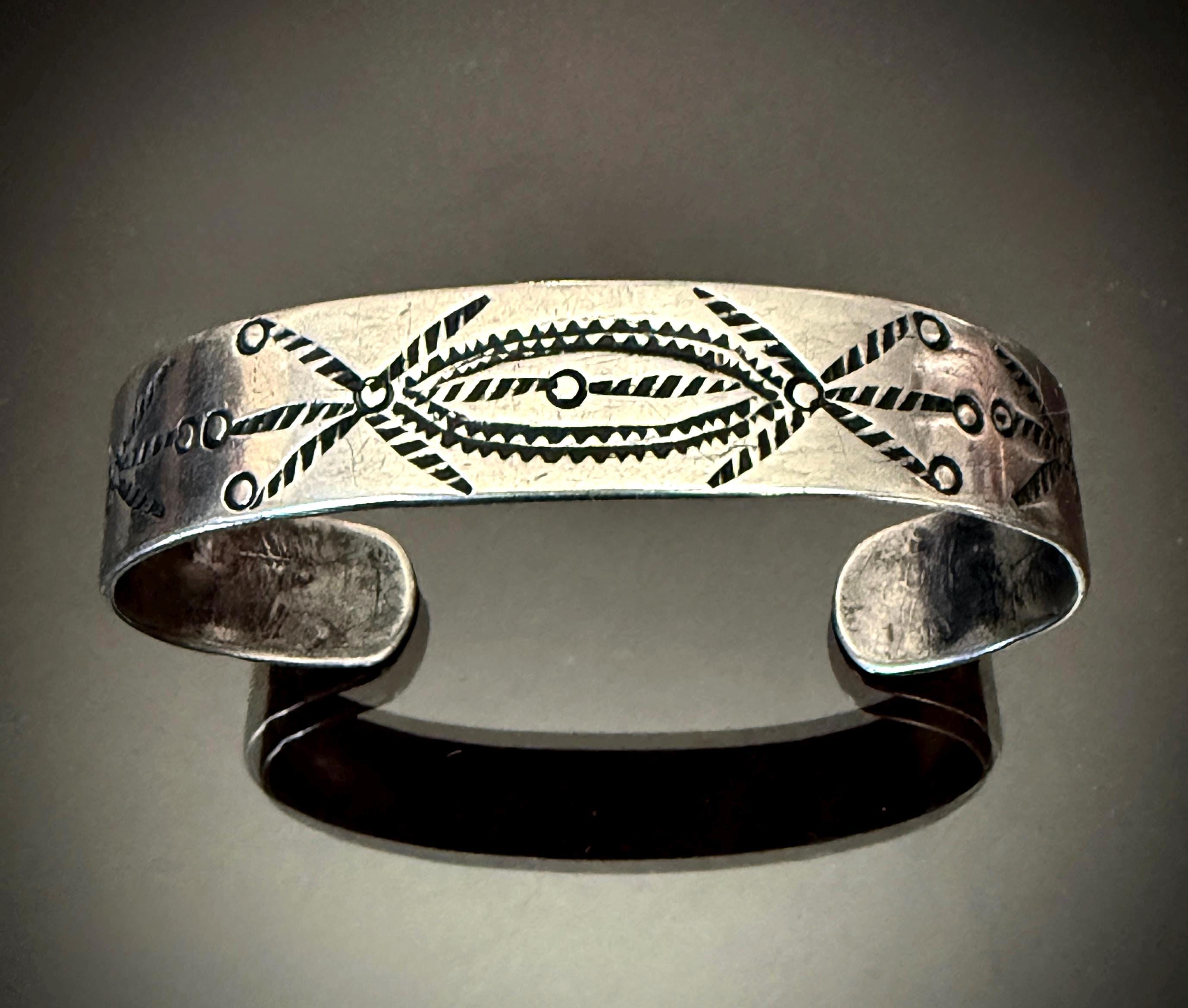 This is a great example of a simple silver ingot cuff from the late 19th or early 20 century. It's decorated with available tools, such as a chisel, a punch, and a crude hand made arched stamp with serrated edges. The silversmith used only 20 grams of silver for this one, but it is a beauty!
