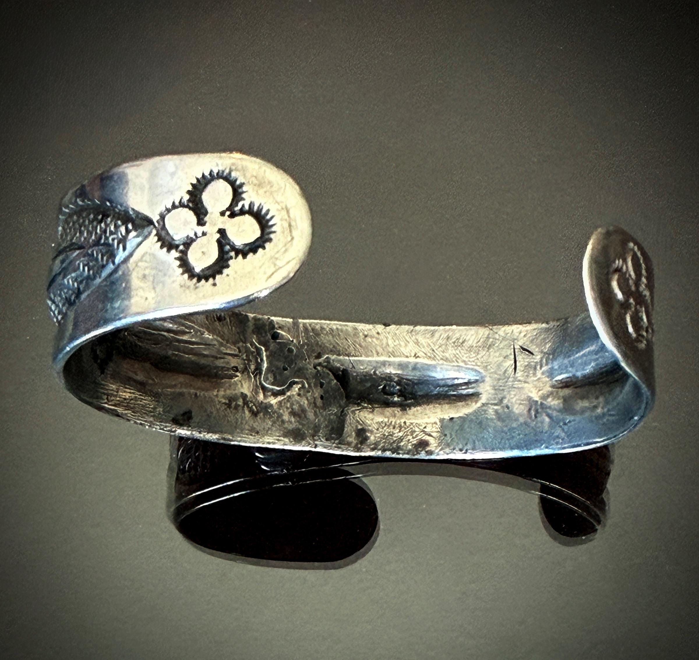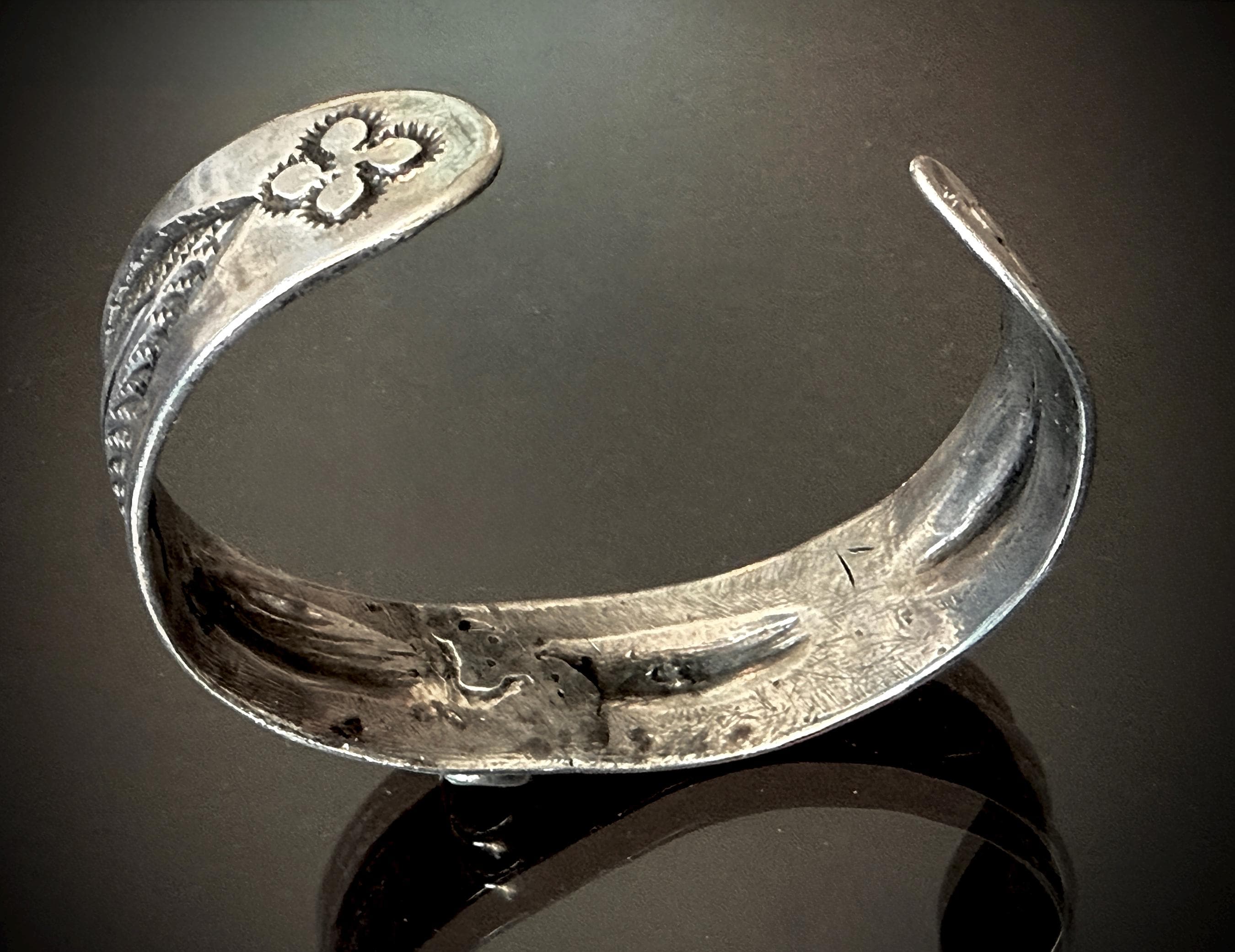 Navajo ingot cuff circa 1890-1900 employing an early method of repoussé using a chisel. Deep green hand cut Cerrillos turquoise set in hand made bezel. As can be seen in the photos, there was an early repair due to a crack in the center above the stone which has made it completely stable. From the estate of an Arizona collector. Weight 32 grams