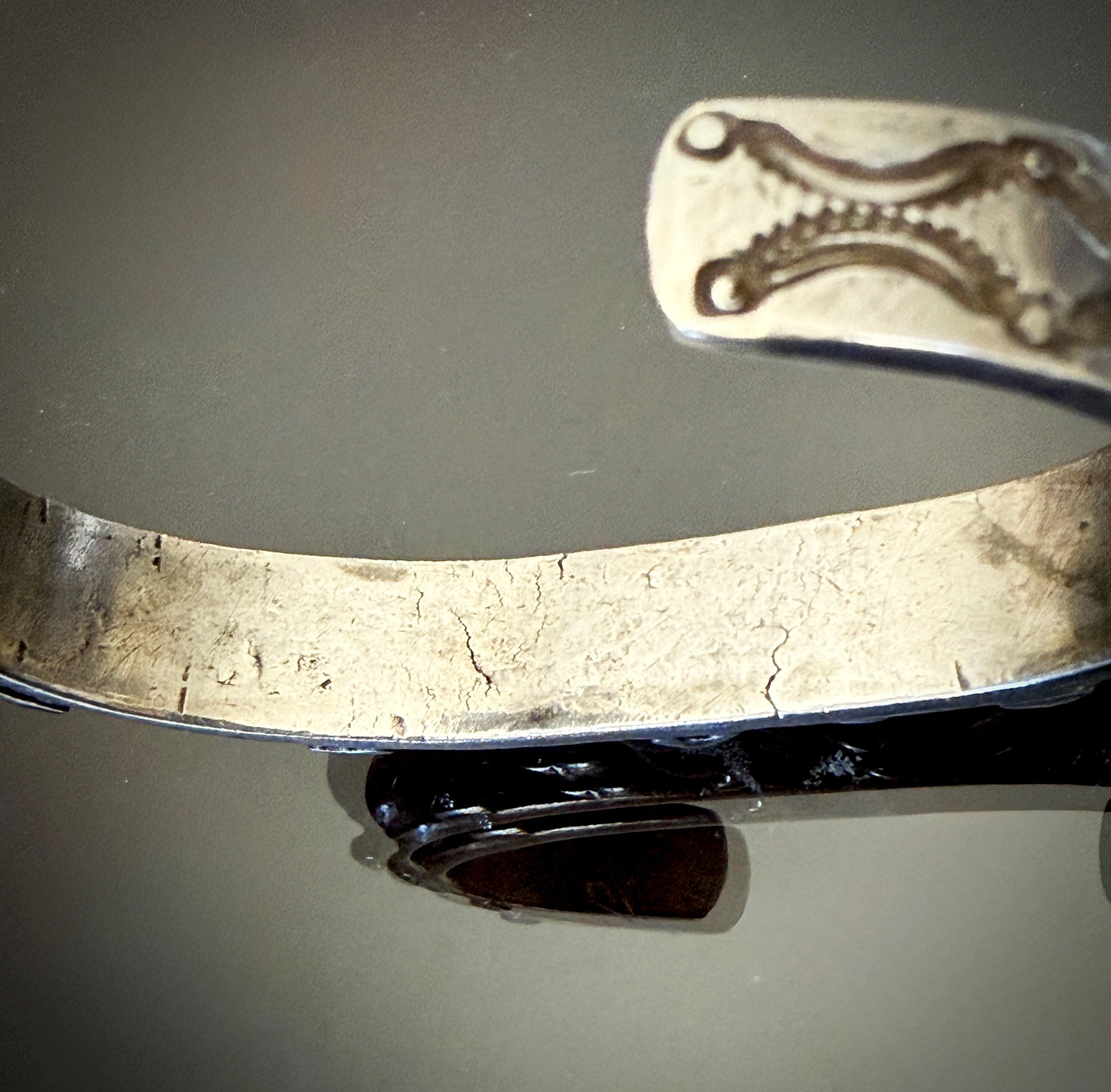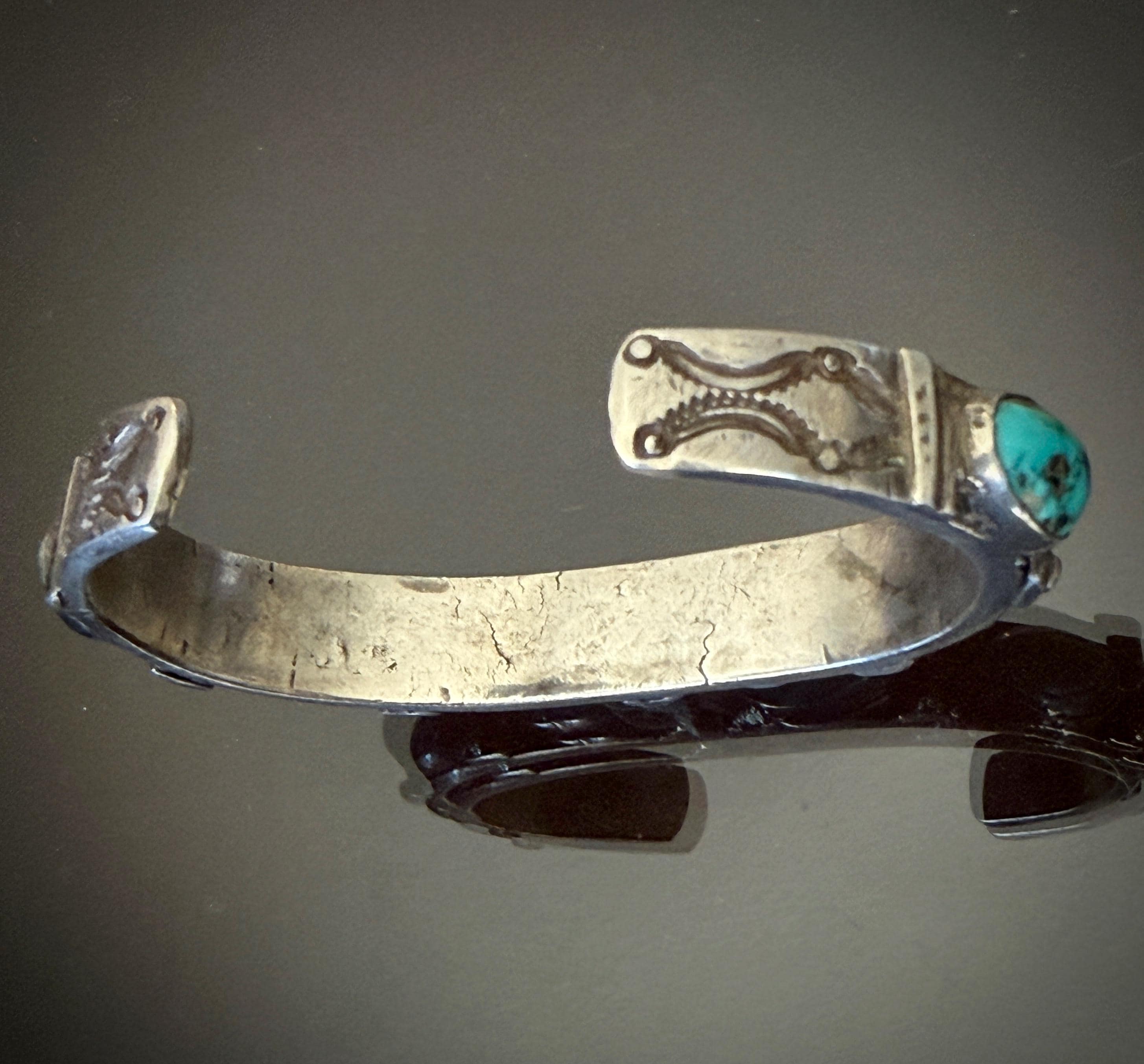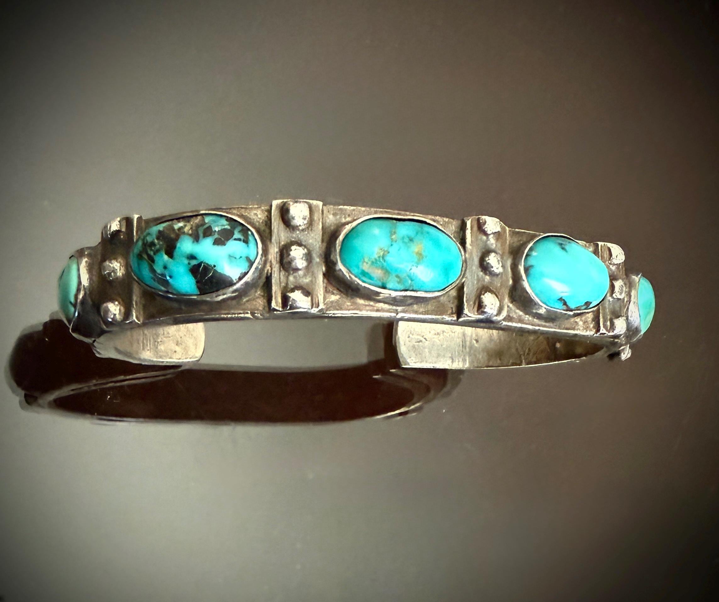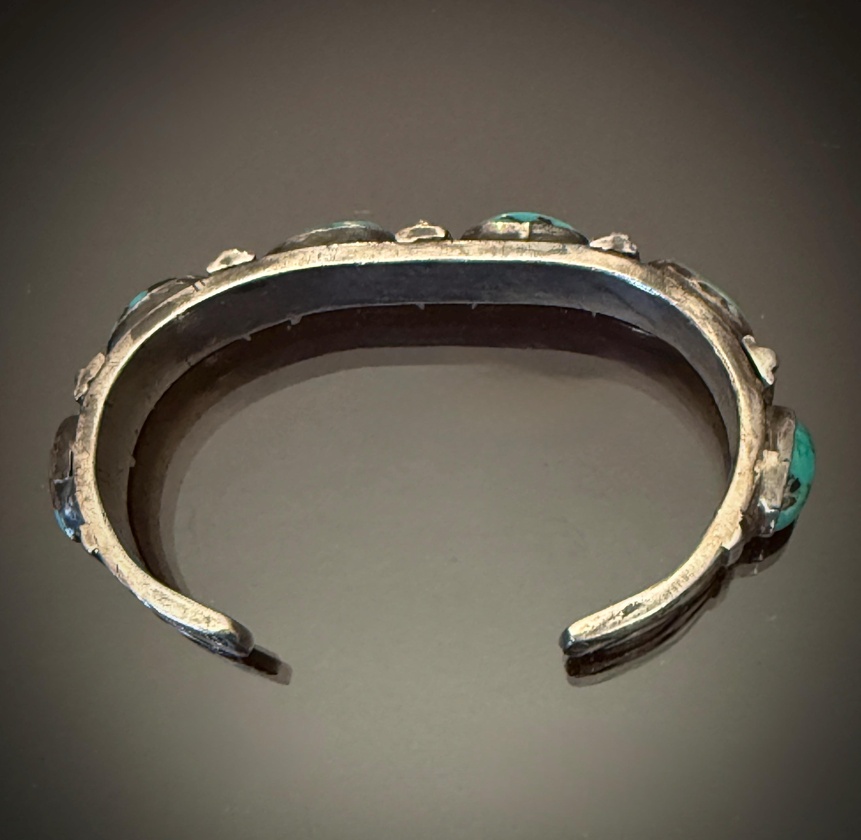 Heavy hand hammered Navajo or Pueblo ingot bracelet with 6 oval turquoise cabochons separated by silver bars with 3 raindrops each. The ends are deeply hand stamped, Circa 1900-1910