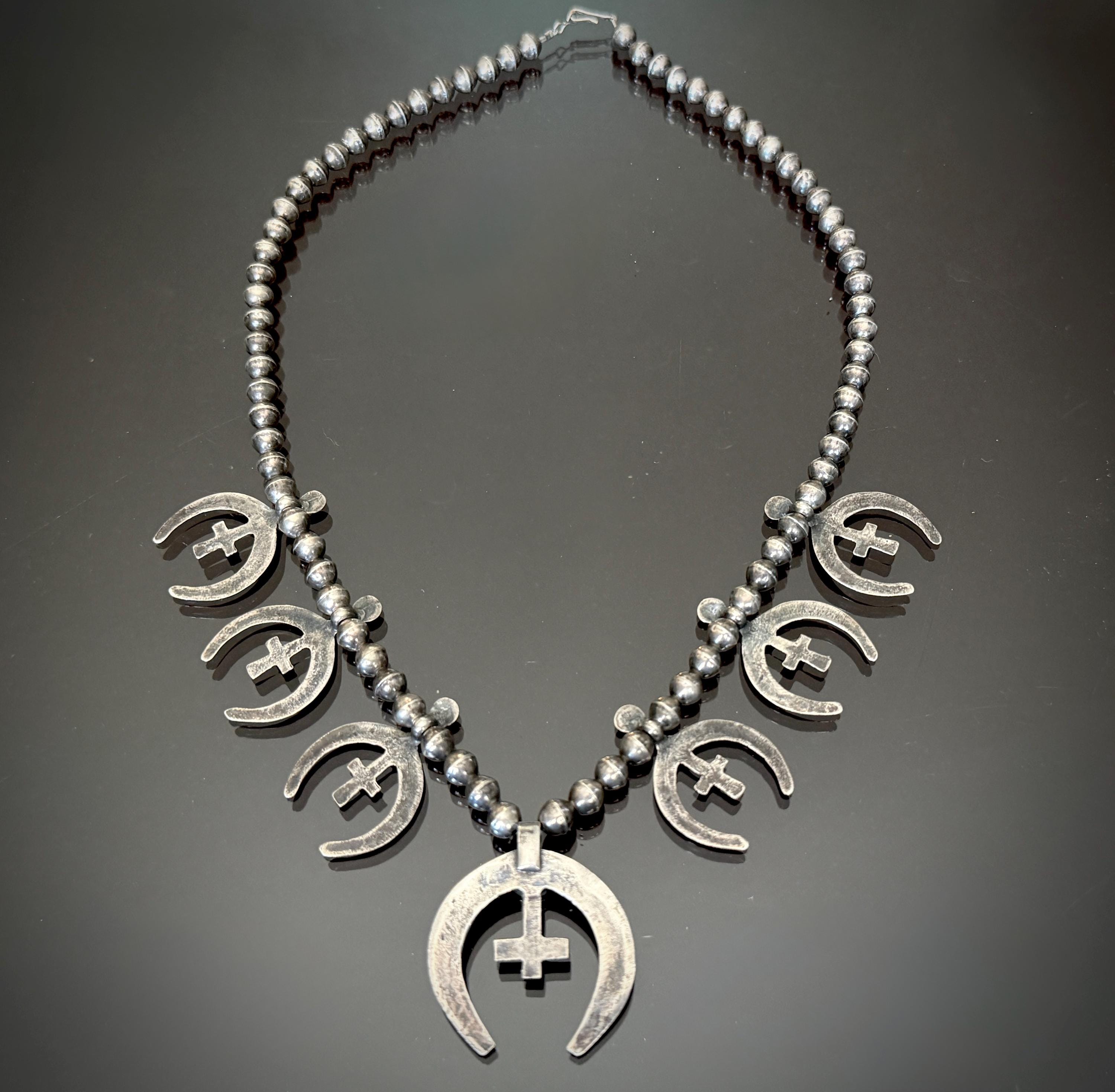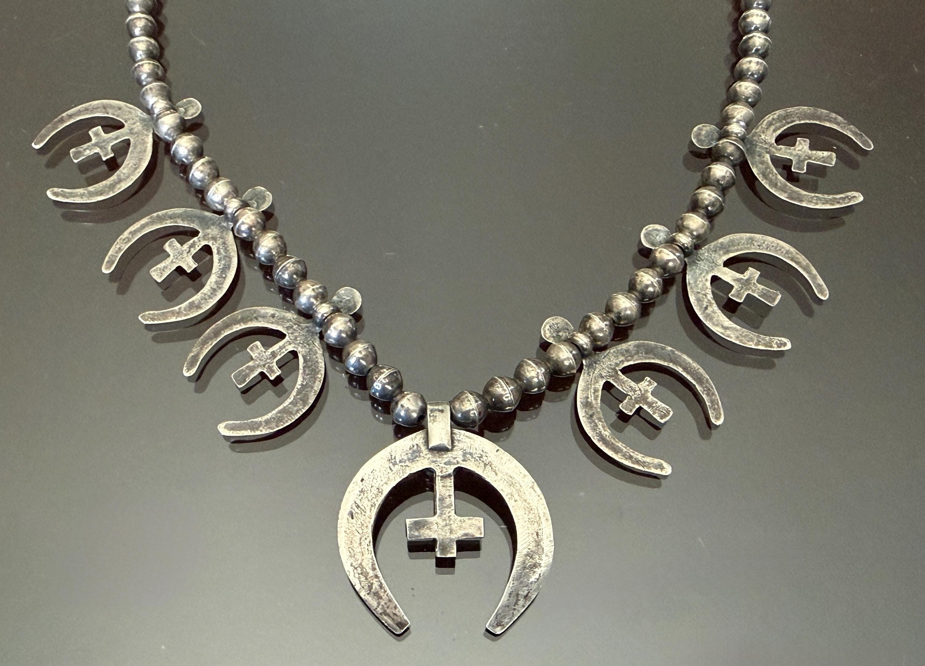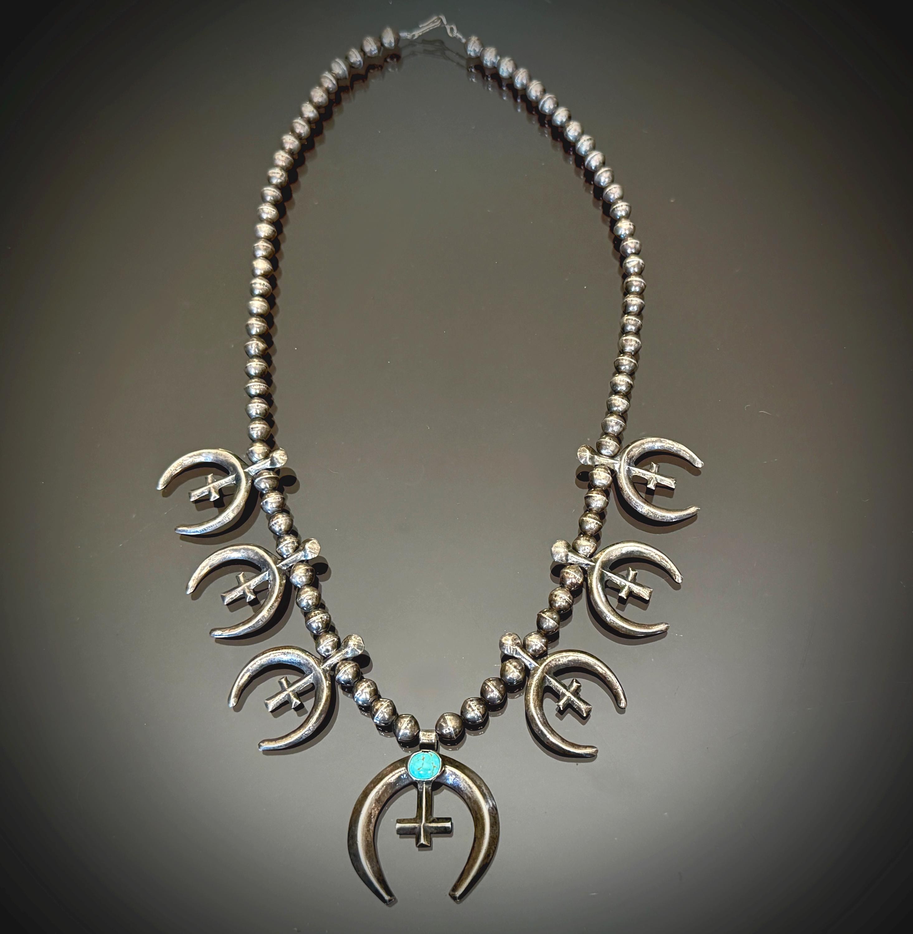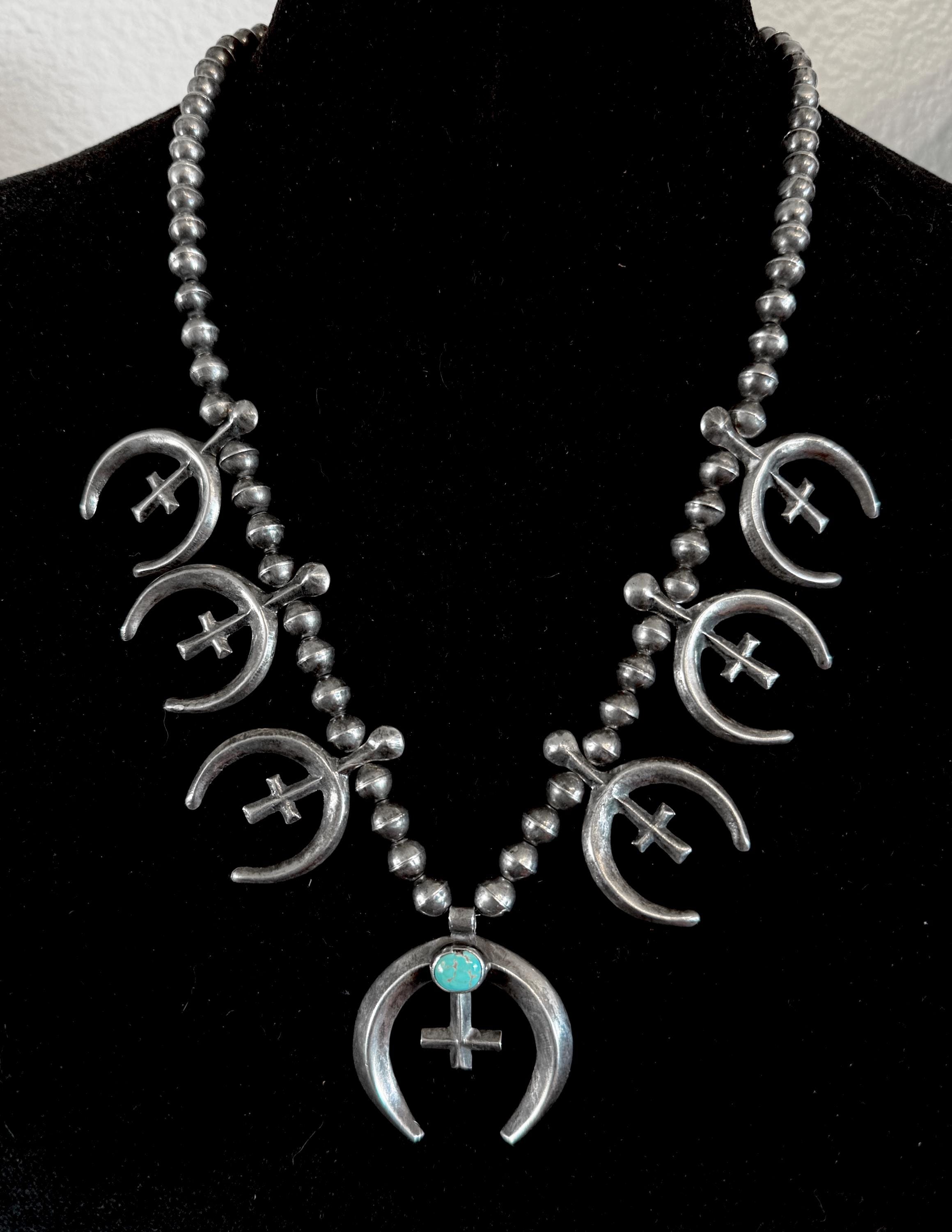 Another unusual "Sqaush Blossom" style necklace, featuring naja's with crosses instead of actual squash blossoms. I have always loved the naja's that feature crosses in the center, it just so aesthetically pleasing. The necklace length is 24" with a hook clasp, and has handmade silver beads with 4 between each naja. The Central naja has an oval turquoise cabochon. Weight: 78 grams