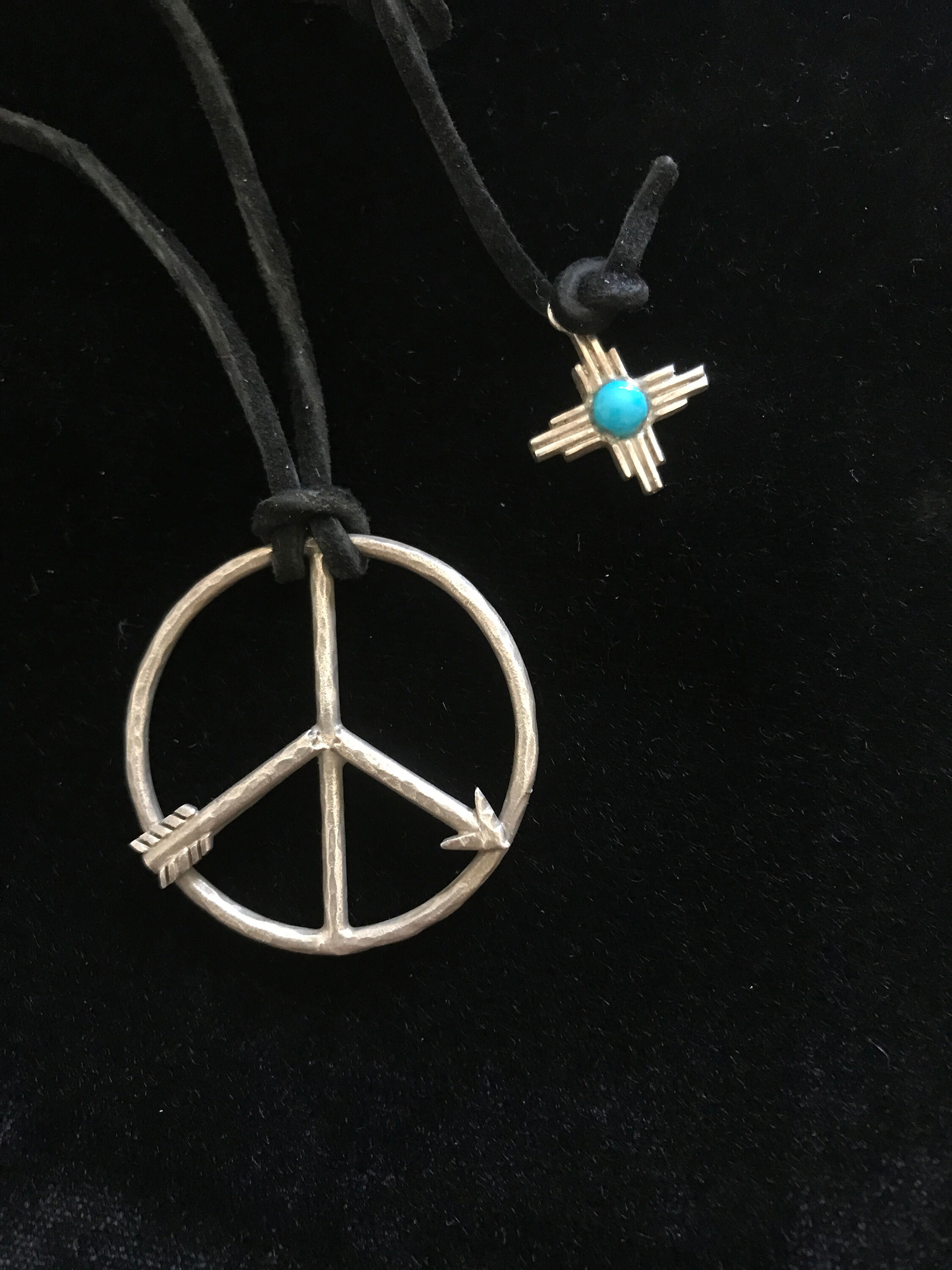 Broken Arrow Peace sign made by Navajo silversmith Fritson Toledo of Albuquerque, New Mexico. Pendant is on leather cord, there is also a small Zia sun with turquoise pendant that drops behind neck when worn. Both pendants made from sterling silver.